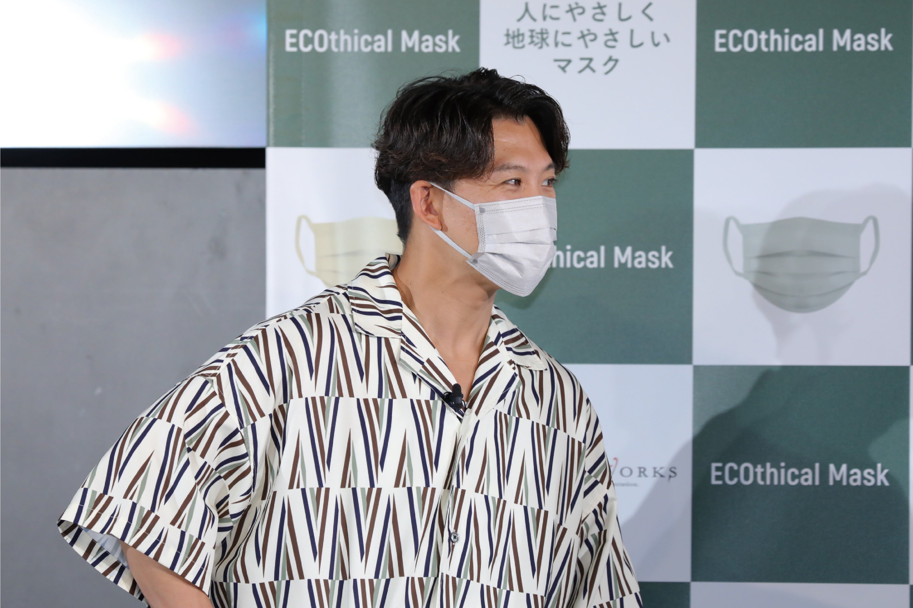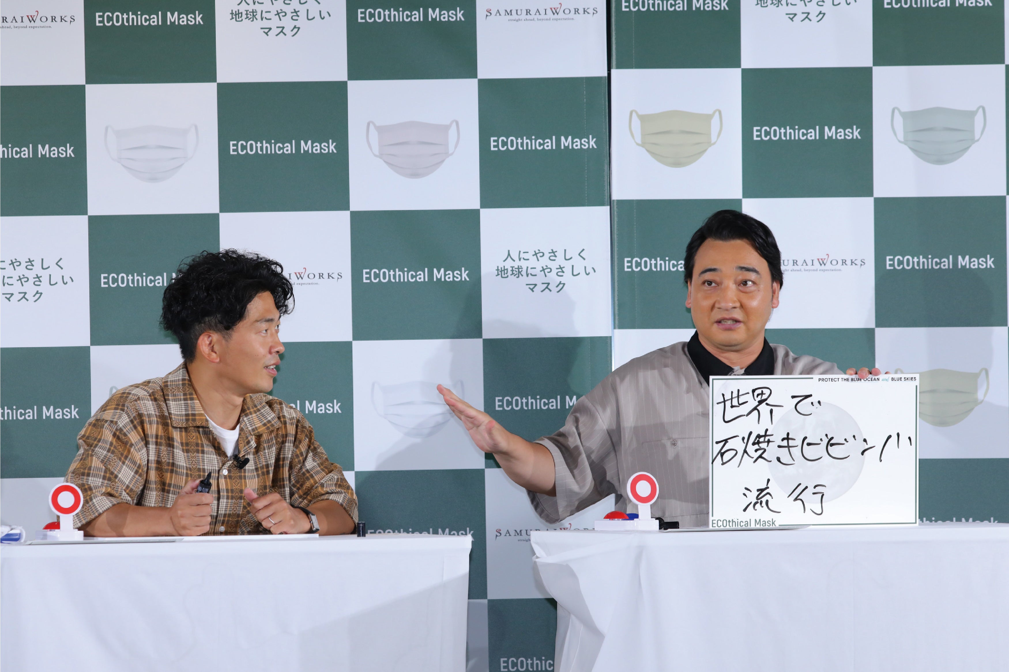 最後に、アンバサダーの谷まりあさんからは「マスクが原因の環境問題がすごく深刻になっていることは、私も今回すごく勉強になった。一人でも多くの人に環境にも人にもやさしいエコシカルマスクを届け、使ってもらう為にも宣伝隊長として頑張りたい。強力なサブアンバサダーを発掘できたので、おたけさんをはじめとしたお三方にご協力いただいて、優しいお兄さんたちと共にエコシカルマスクを広めていきたいです。」とコメント。三本勝負の勝者となったおたけさんですが、大人の事情により“サブアンバサダー候補”に就任。候補ということに「冗談じゃねーよ」とストレートなツッコミも。「環境問題を考えさせていただく時間だった。候補という形なので、サムライワークスさんと共に三人四脚で頑張りたい。」と意気込みました。