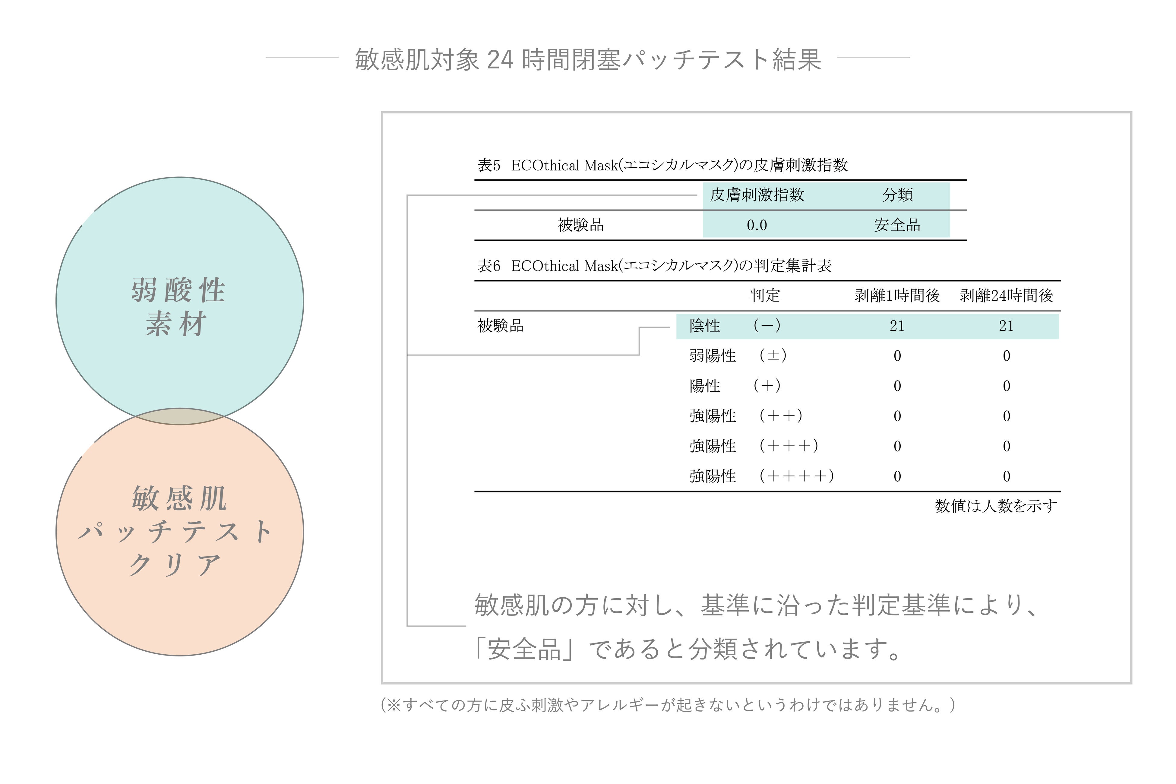 植物由来の不織布を使用したECOthical Maskは、肌にやさしいマスクです。 人の素肌のpHバランスは中性より少し酸性の「弱酸性」です。 肌に近い弱酸性の素材を使用することで、肌への刺激を軽減。 敏感肌の方も安心してお使いいただけます。