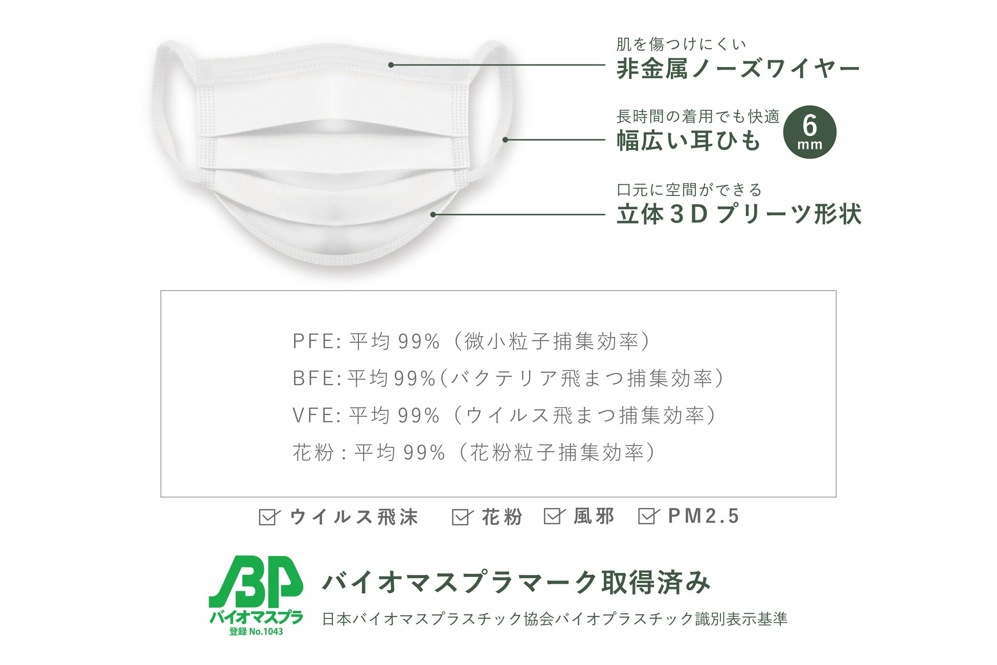 PLA樹脂(ポリ乳酸)でできた不織布は、製造・破棄する際に二酸化炭素の排出を軽減し、地球の温暖化へのリスクを減らします。生分解されたマスクが再び大地に還り、新しい自然を生み出すサイクルを構築することで、環境への負担を抑えることを目指します。「感染を予防しながら、ごみを流出させない。」環境負荷が低く、短期間で土に還ることができるマスクを通じて、私たちは地球環境の保全に取り組みます。▼詳細はこちら