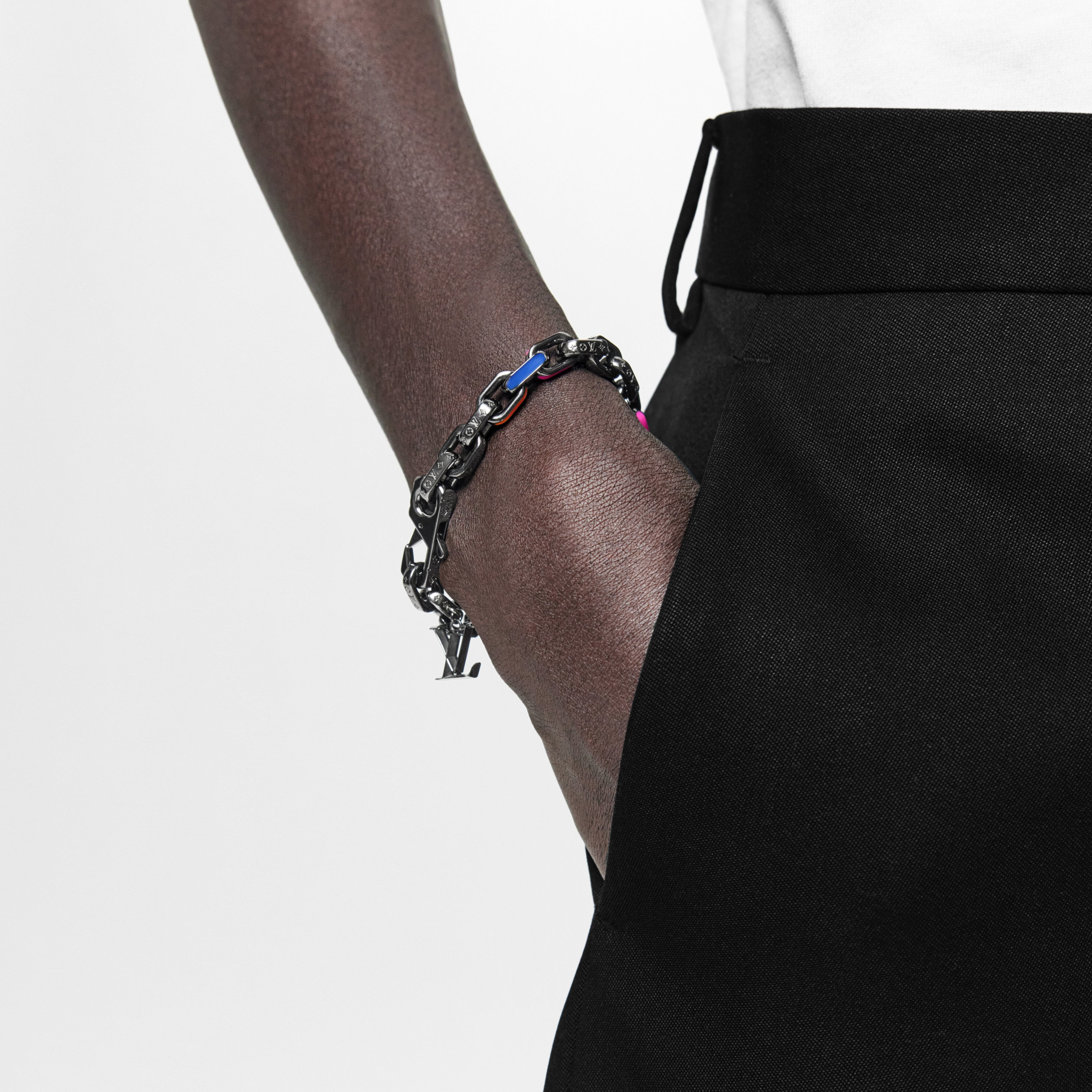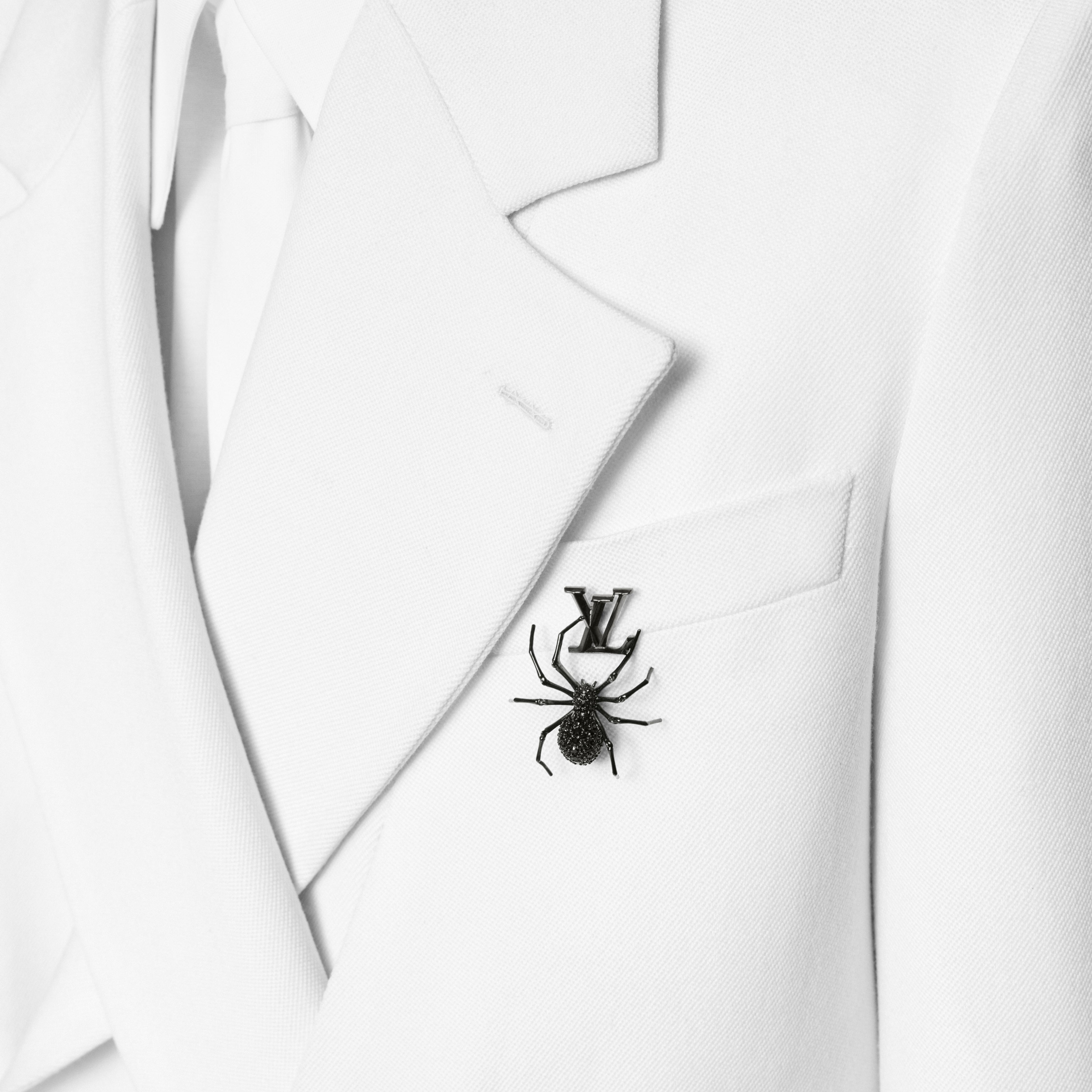 またLV イニシャルと共にデザインされるカラフルな色合いやユニークなモチーフも魅力的なポイントのひとつ。色の組み合わせが独特なブレスレットやピアスに、LV イニシャルがマーブル模様に染まったトップのネックレス、中でもより目を引くクモ モチーフのブローチは、リアルなフォルムにストラスが輝きを添えています。