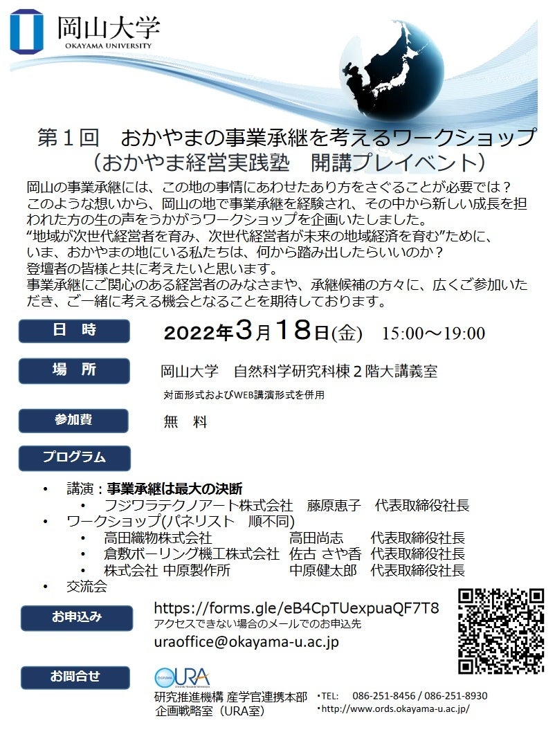 国立大学法人岡山大学(本部:岡山市北区、学長:槇野博史)の研究推進機構産学官連携本部と企画戦略室(URA室)は、2022年3月18日(金) 15:00~19:00に「第1回おかやまの事業承継を考えるワークショップ」を、岡山大学津島キャンパスの岡山大学自然科学研究科棟2階大講義室で開催します。