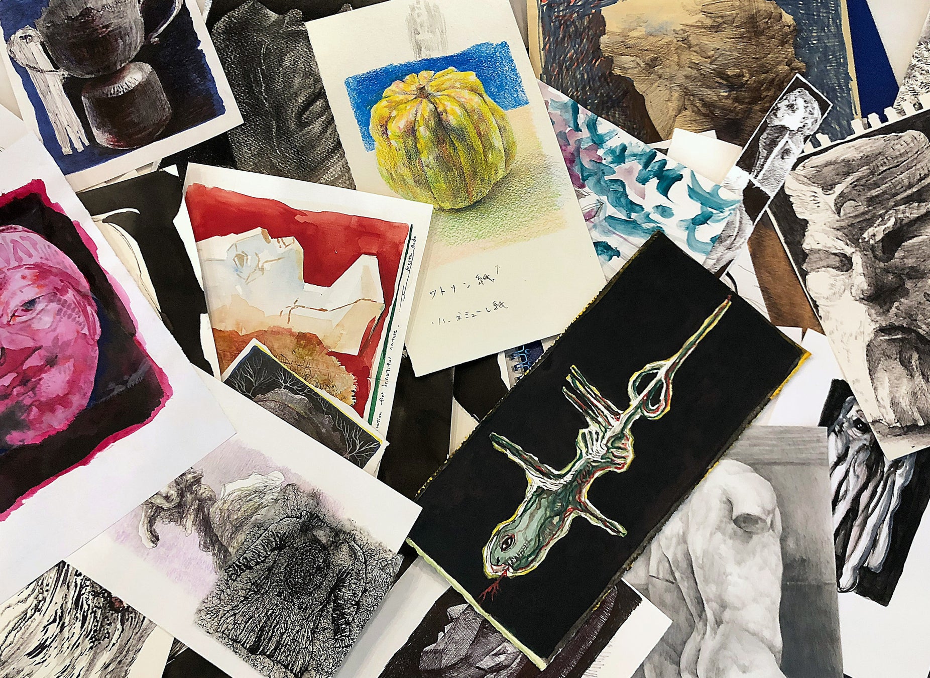 自由な発想から生まれたスケッチだけでなく、時間をかけて描き込まれた緻密な絵まで、制作の原点ともいえる思考や感情の揺らぎがそのまま刻まれています。