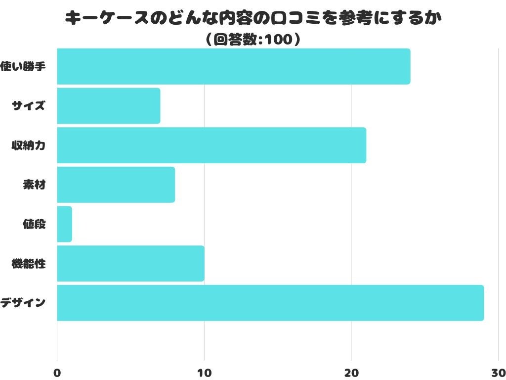 キーケースのどんな内容の口コミを参考にするかをアンケートにて調査したところ、1位は「デザイン」でした。