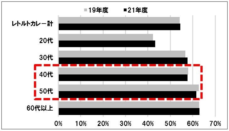 レトルトカレー市場の裾野拡大には、従来購入率が高いが直近では低下傾向にある40~50代へ向けた新奇性の