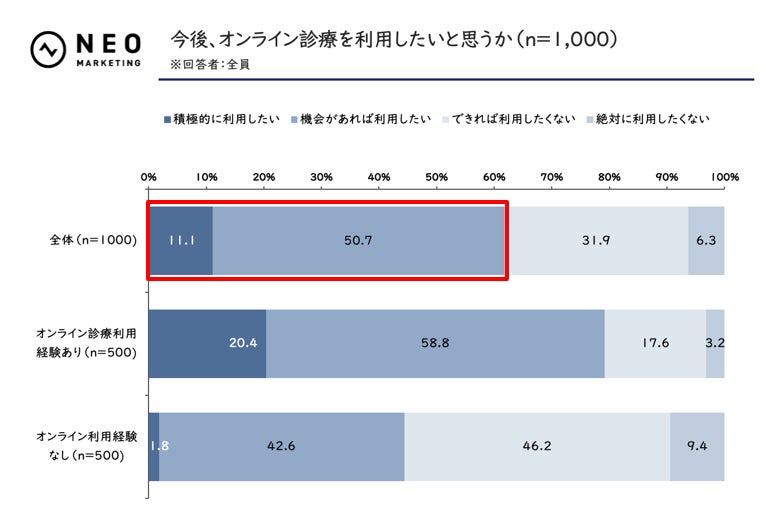 全体の利用意向は61.8%(※)に。そのうち、オンライン診療利用者は79.2%にまで上りました。