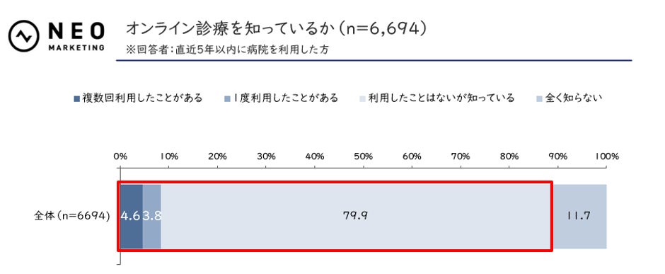 まずはスクリーニング調査にて、直近5年以内に病院を利用した人に対して「オンライン診療」を知っているかお聞きしました。
