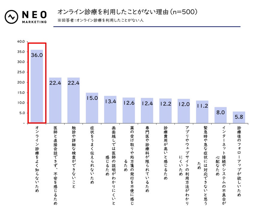 オンライン診療を利用したことがない理由、「よく知らない」が36.0%でトップ|オンライン診療に関する調査