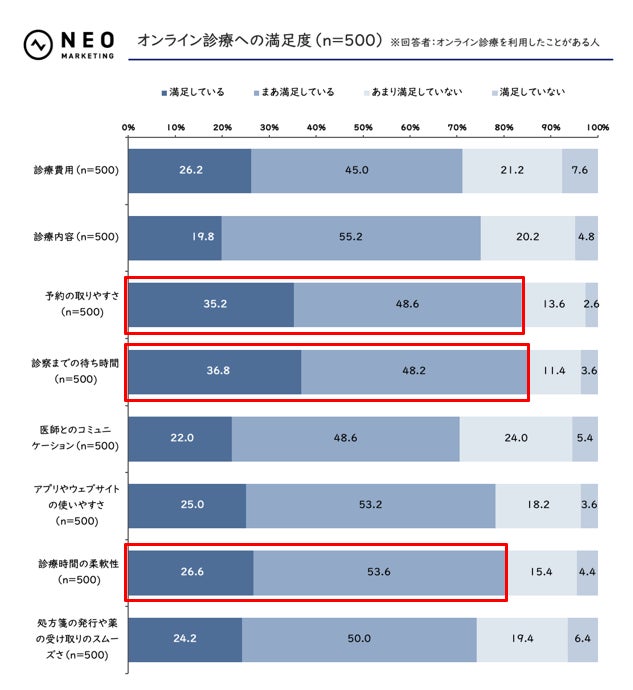 「予約の取りやすさ」「診察までの待ち時間」「診療時間の柔軟性」の、日時の柔軟性や時短にかかわる3項目の満足度が80%以上(※)となりました。