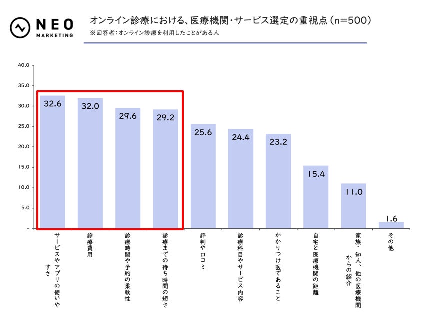 「サービスやアプリの使いやすさ」「診療費用」「診療時間や予約の柔軟性」「診療までの待ち時間の短さ」の4項目が30%前後で並びました。