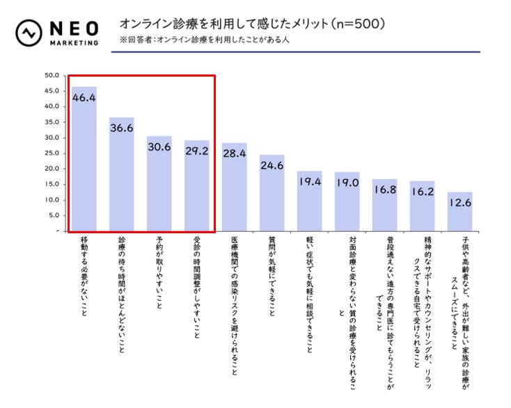 中でも「移動する必要がないこと」は46.4%と、オンライン診療利用者の半数近くがメリットと感じているようです。