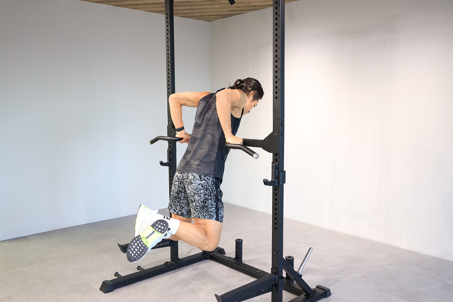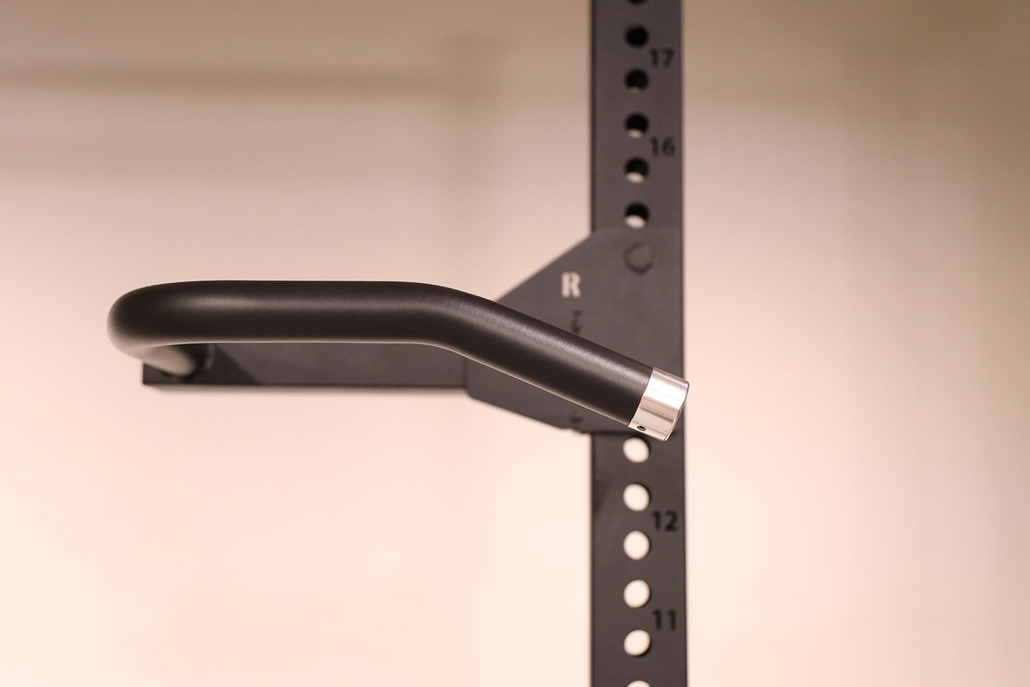 コンパクトながらも本体総重量47㎏で最大80㎜の角フレームを採用。コンパクトながらも頑丈な作りとなっています。耐荷重は上部チンニングバー部分200㎏、ディップス&チンニングアーム部分片手100㎏、バーベルラック部分200㎏、セーフティバー300㎏まで対応。耐荷重検査では工場検査に加え、第三者機関での検査を実施。安心してご使用頂ける設計になっております。