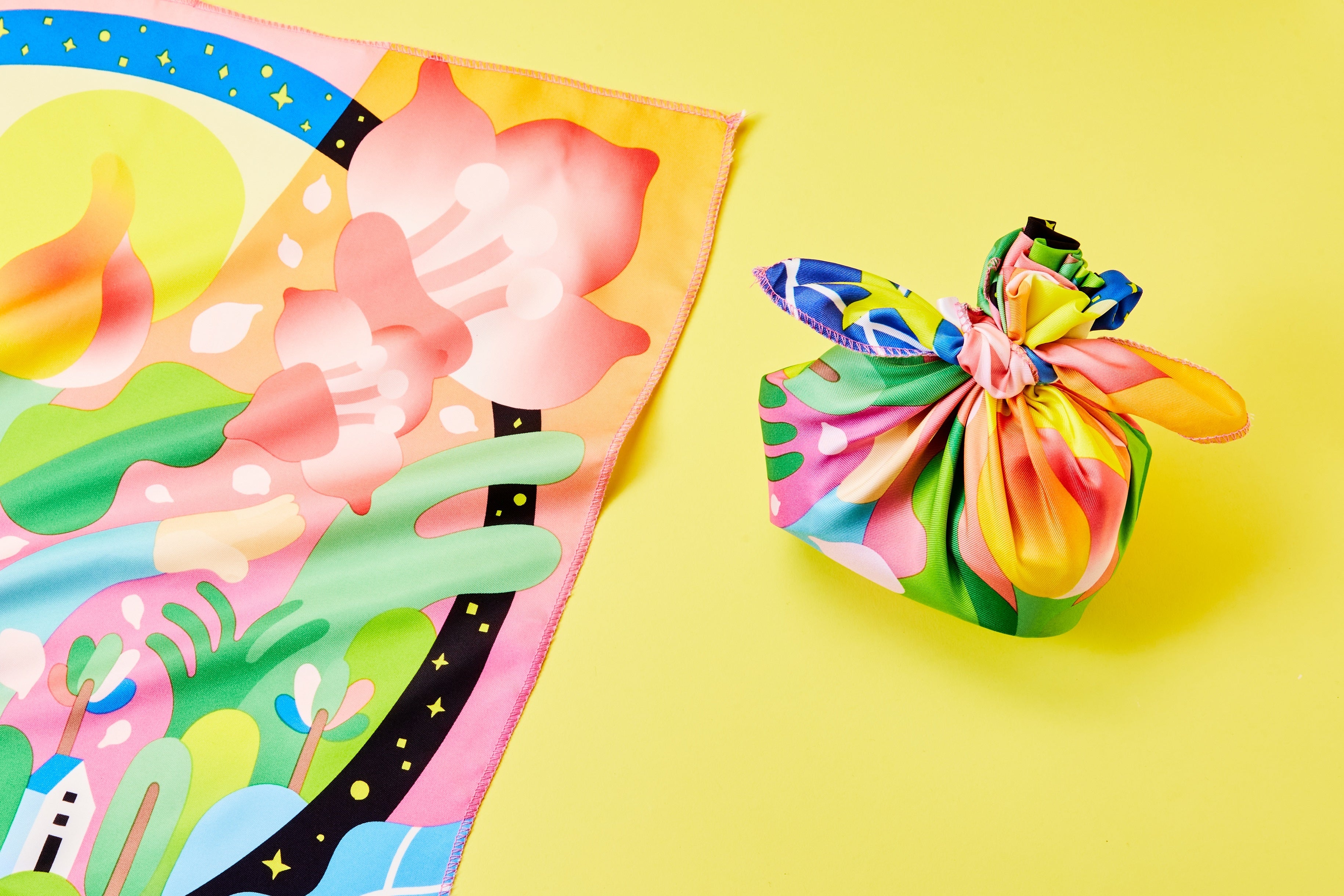ノットラップとは、日本で古来より使われ続けている風呂敷から着想を得たオリジナル風呂敷です。『スプリングタイム ブルーミング ノットラップ』はペットボトル1本分からリサイクルしたポリエステル100%の素材から作られています。ギフトラッピングとしても、ランチクロスやエコバッグなど、この一枚の布の使用方法には限りがなく、何度でも繰り返し使用できます。