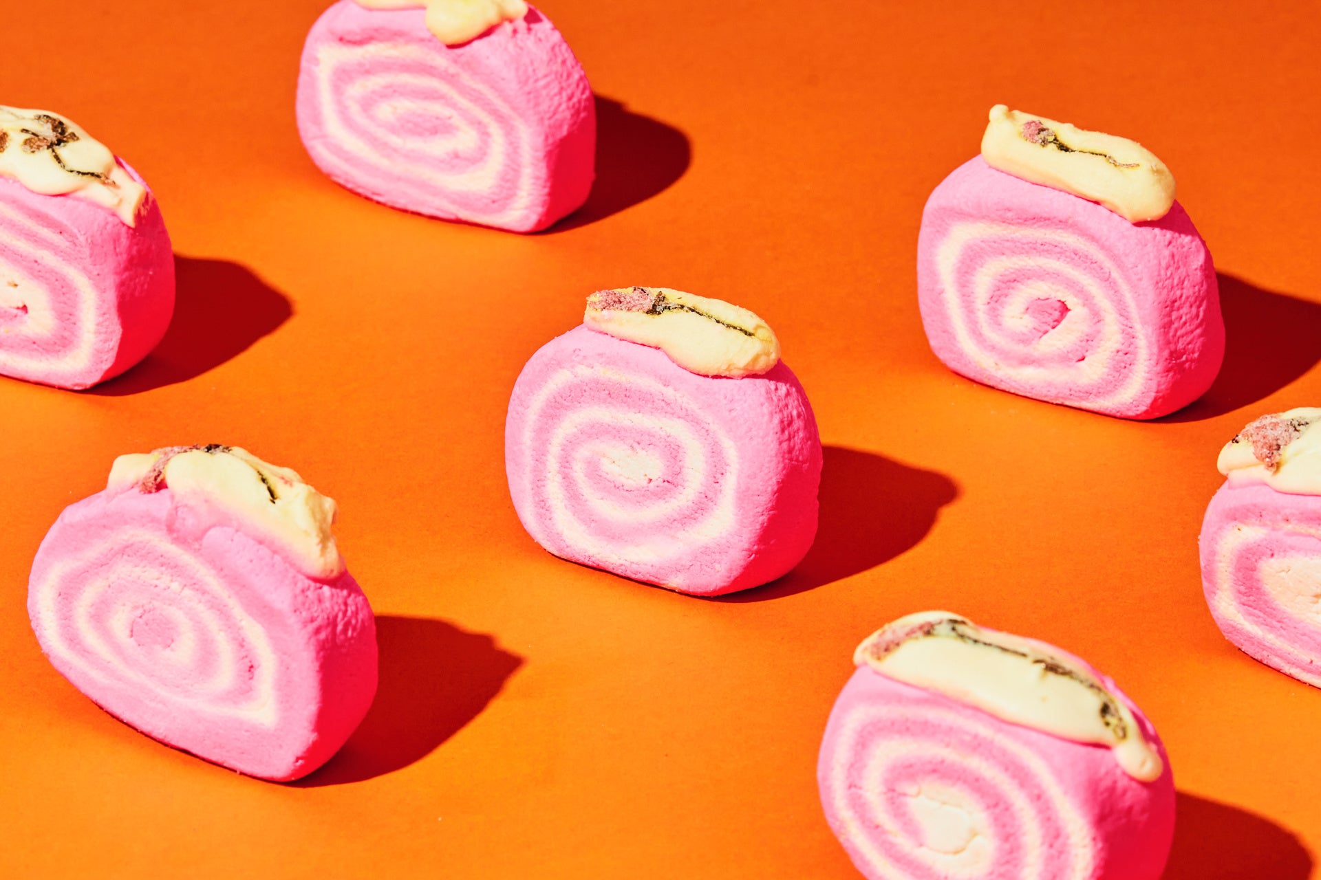 ピンク&ホワイトの春色がかわいい、ロールケーキのようなバブルバー(泡風呂用入浴料)です。お肌を引き締めるレモンオイル、お肌に潤いとハリを与えるミモザエキスを配合。