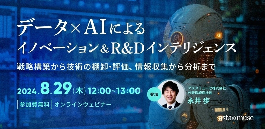 アスタミューゼ株式会社(本社:東京都千代田区、代表取締役社長 永井歩)は、2024年8月29日(木)12:00-13:00に、新作ウェビナー「データ×AIによるイノベーション& R&Dインテリジェンス~戦略構築から技術の棚卸・評価、情報収集から分析まで~」を無料で開催いたします。