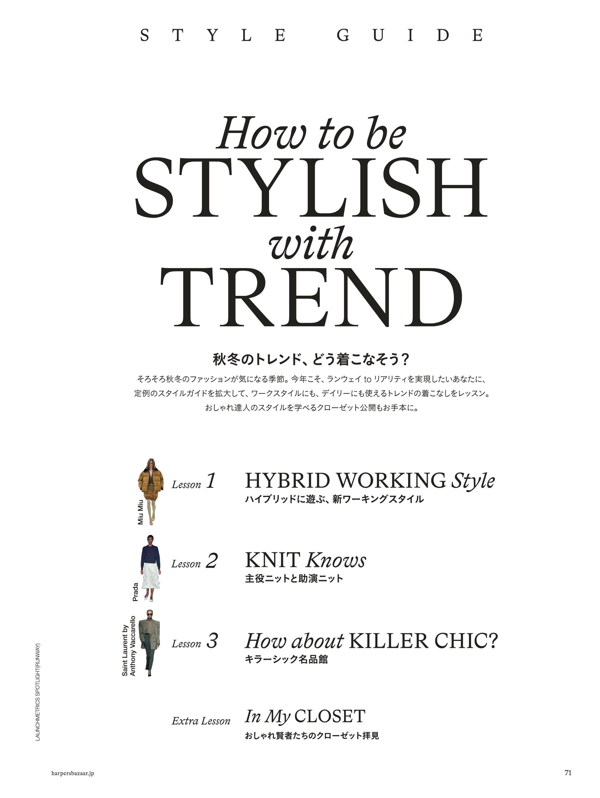 定例のスタイルガイドを拡大して、新たなワーキングスタイル、主役ニットと助演ニット、キラーシックなアイテムなど、トレンドをデイリーに着こなす術を紹介します。