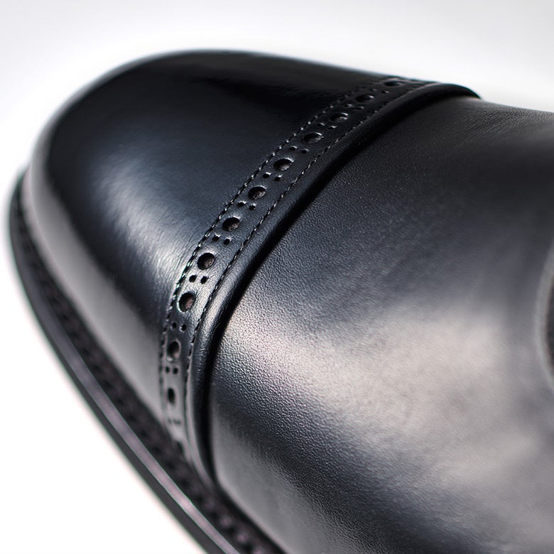 靴紐を排し、履き口部分に伸縮する帯状のパーツをあしらって足をホールドするサイドエラスティックシューズ。いかにも誂え靴らしいデザインで足元を彩ります。「謹製 蔵之丞」ならではの特徴は、「カールエッジ」と呼ばれる仕立て。トウやヴァンプなどを縫い合わせる際、革の端を折り返してからステッチをかけることで、繋ぎ目に独特な立体感を生み出しているのがポイントです。さらに注目していただきたいのは、エラスティックパーツの仕上げ。よく見ると、表側のレザーを上部で折り返し、内側まで包み込むように配していることがわかります。これにより、上から見たときの美しさを高めました。微細なディテールまで突き詰めて美観を追求する。これもプレステージラインならではの作り込みです。