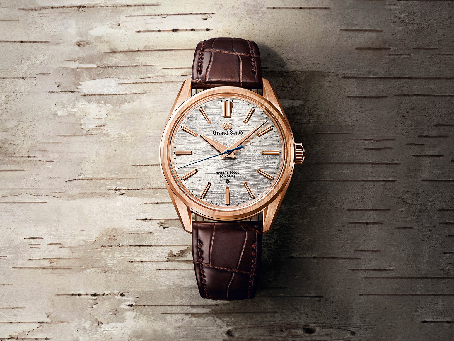 「グランドセイコースタジオ 雫石」と同じ岩手県にある平庭高原には、約400ヘクタールという広大な面積に、荘厳な白樺林が自生しています。本作のダイヤルは、明るい場所に向かってすらりと伸びる白樺の、凹凸が不規則に連なる樹皮の美しさを、精緻な型打模様で表現しました。