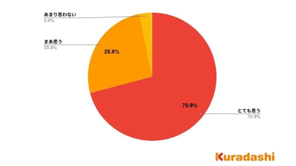 Kuradashiが10月に行ったユーザー調査(※3)によると、「値上げを受けてよりお得に商品を購入したい」という設問に対し、「とても思う」と回答した方が70.9%、「まあ思う」と回答した方が25.8%で、回答者全体の96.7%がよりお得に食品を購入したいと考えていることが読み取れます。