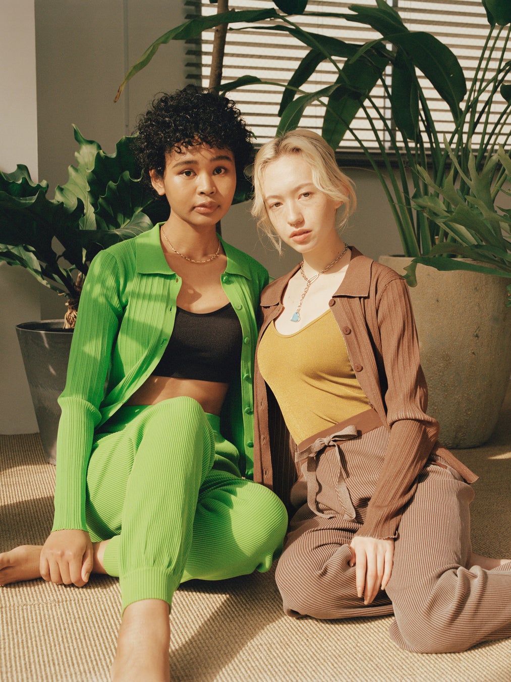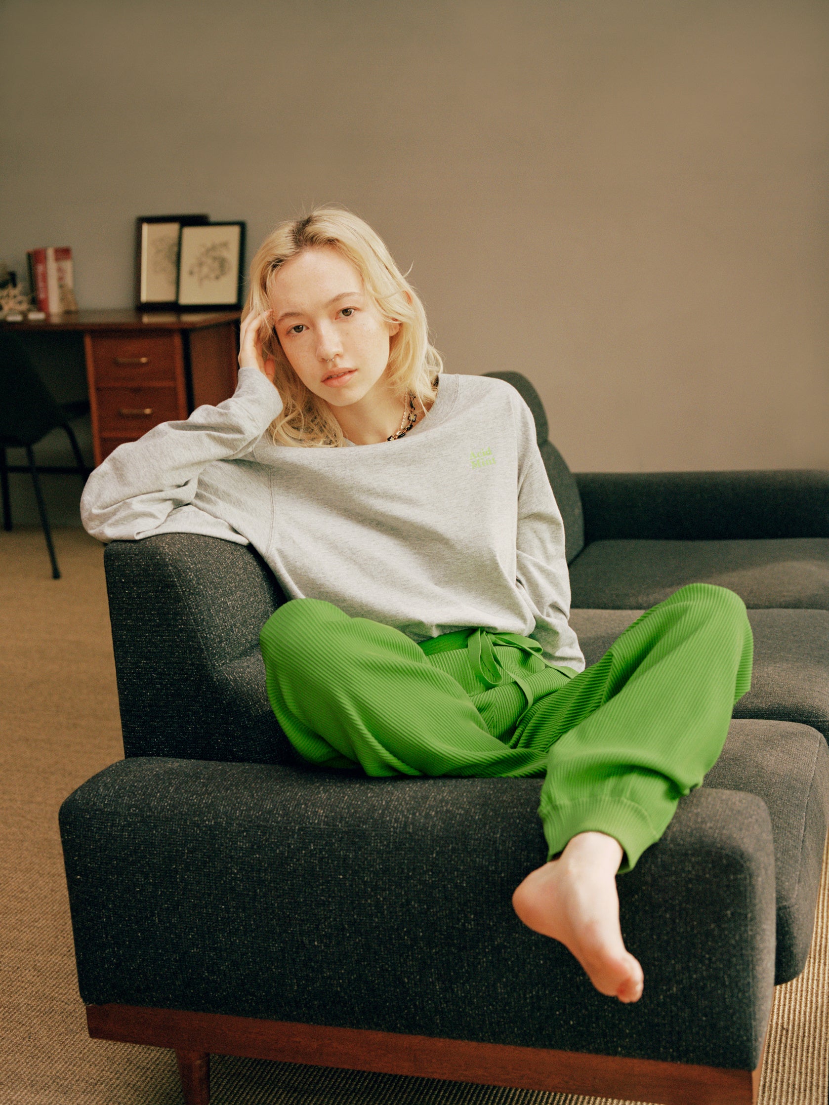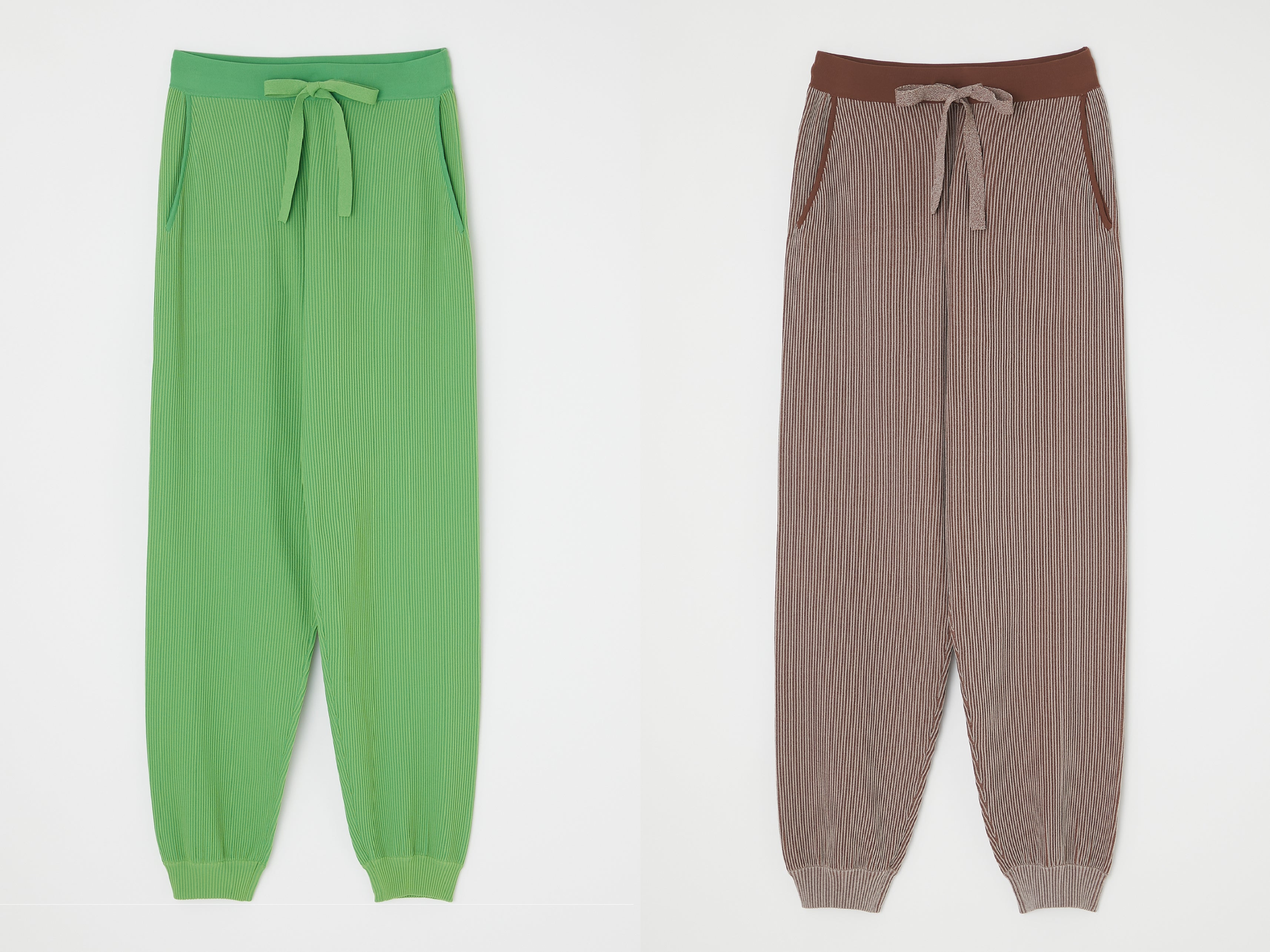 カーディガンと同じ素材を採用し、着心地の良さはお墨付き。締めつけのないウエスト周りでリラックスした時間を過ごせるはず。リブ編みの表と裏の糸をバイカラーにすることで、ストライプ見えし、Iラインを強調してくれる。