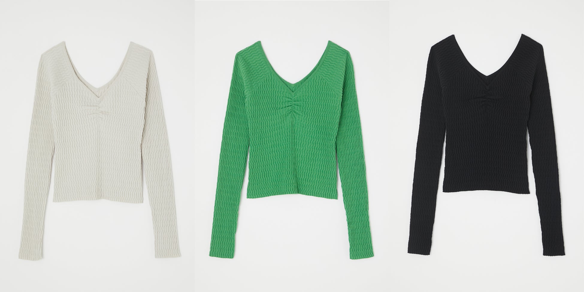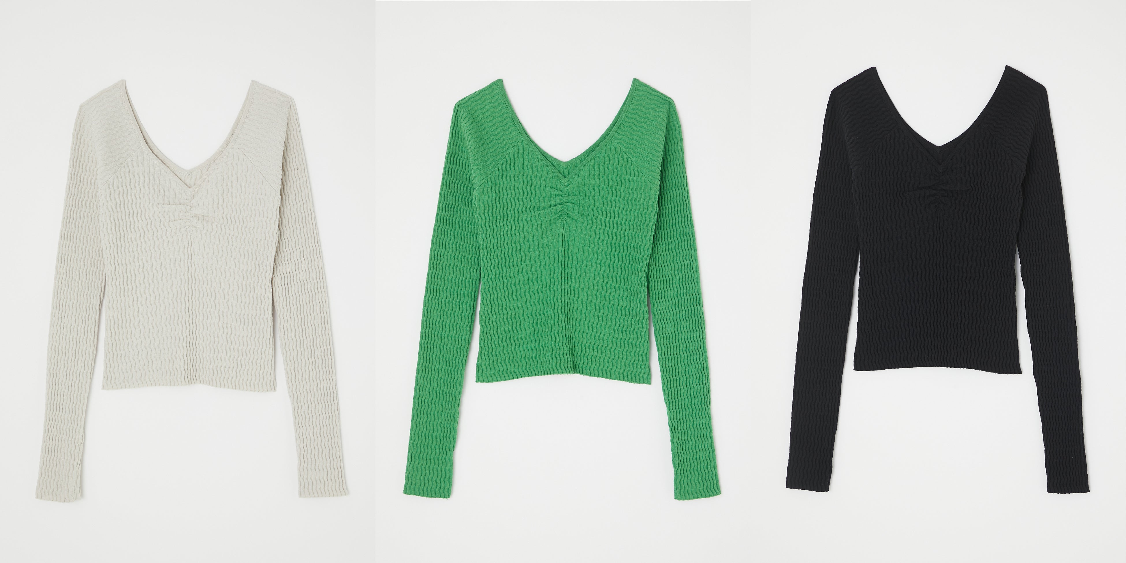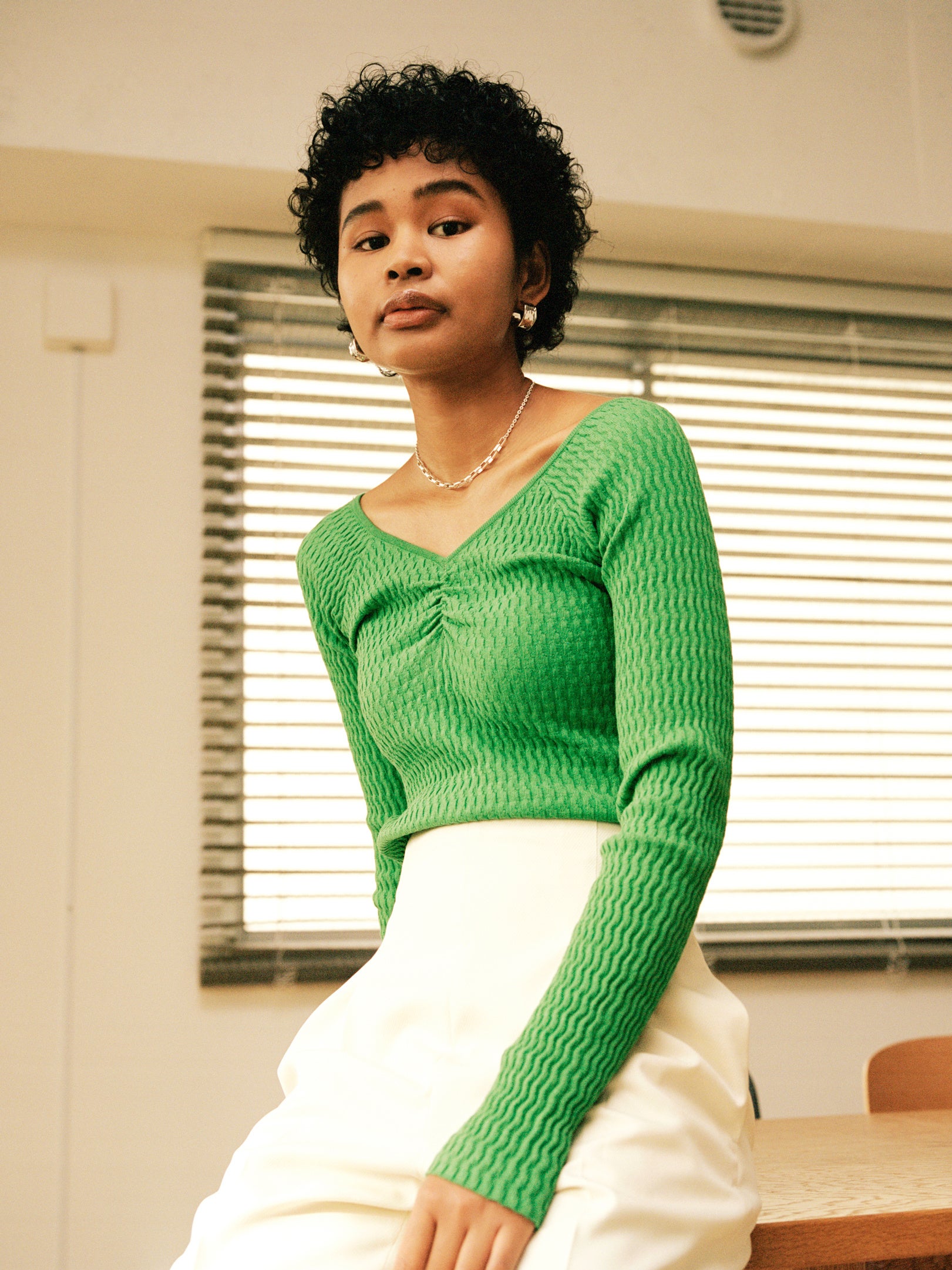 表面感のあるジャガード編みのニットトップスは、広めのVネックがデコルテをキレイに見せてくれる。フロントのシャーリングでデザイン性をアップ。オーガニックコットンをブレンドするなど、素材にもこだわりが。