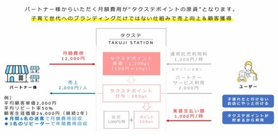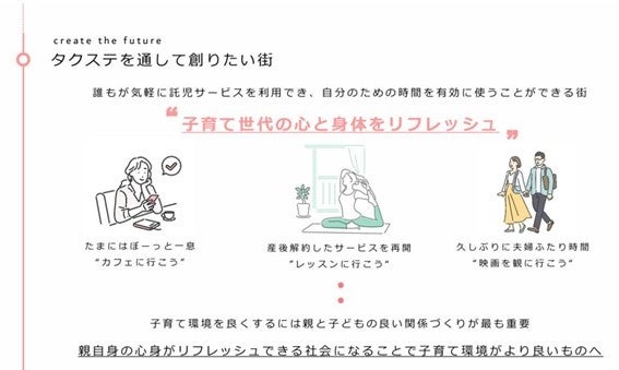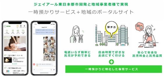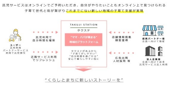タクステは、JR東日本の鉄道高架下を管理・運営するジェイアール東日本都市開発が、駅ナカ・駅チカに「一時託児所」を設置することで、子育てユーザーが簡単・気軽な一時託児の利用が実現し、お子さまを預けた後に、駅周辺で自分時間を過ごすことで子育てユーザーと地域の店舗事業者を繋ぐプラットフォームサービスです。