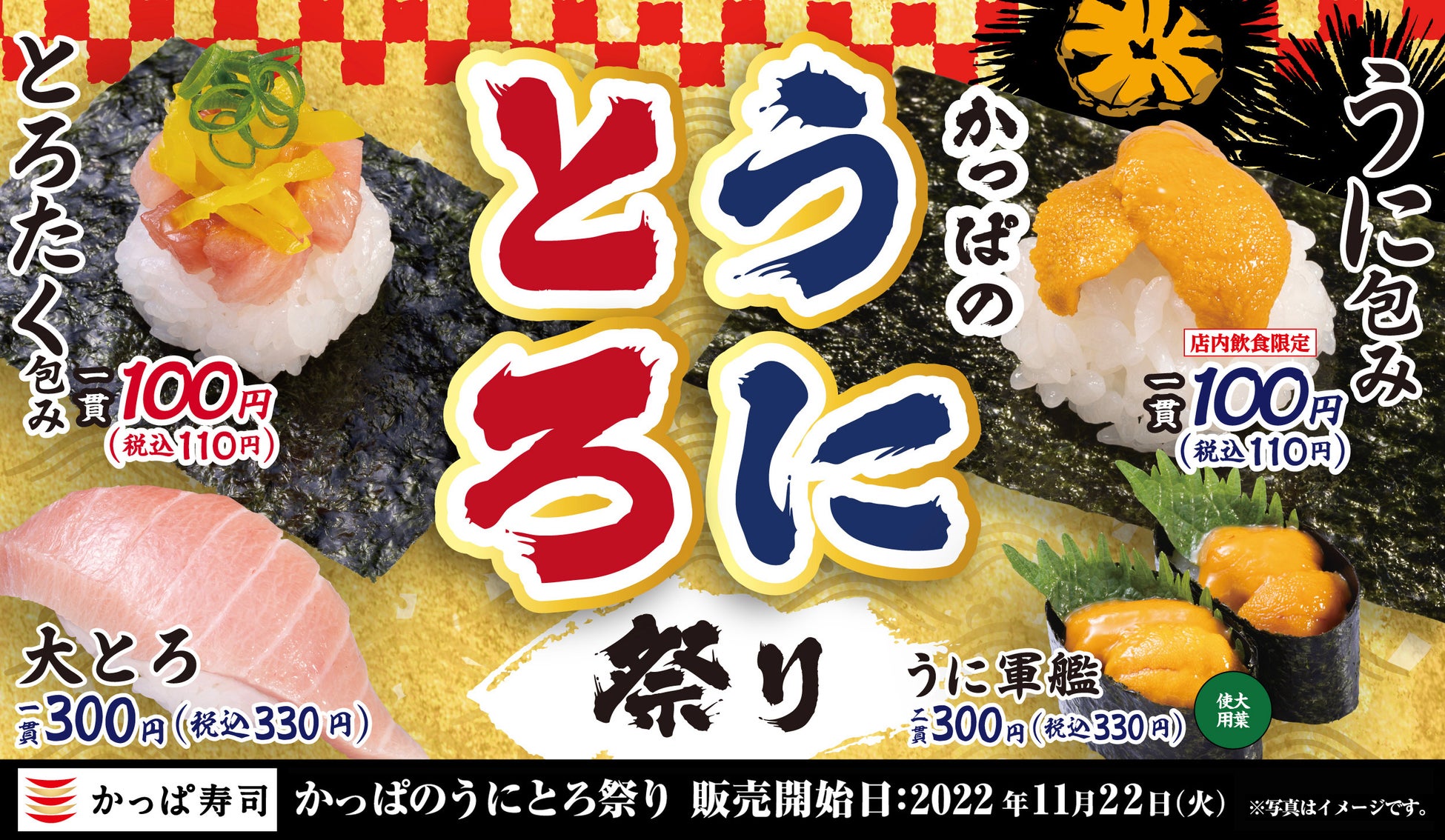 コロワイドグループのかっぱ寿司(カッパ・クリエイト㈱ 本社:神奈川県横浜市)は、2022年11月22日(火)~12月12日(月)の期間、「かっぱのうにとろ祭り」を開催いたします。