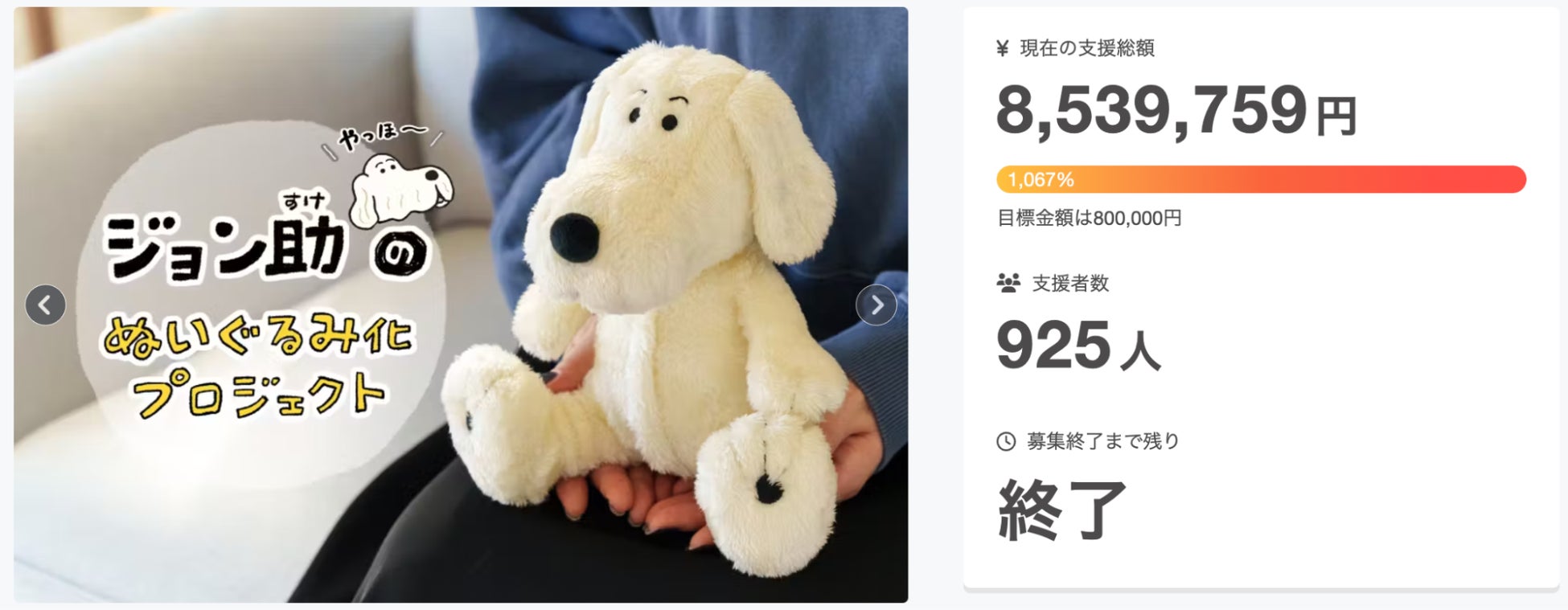 絵本作家・イラストレーターの日隈みさき氏の描く「ジョン助」のぬいぐるみ化プロジェクト。目標金額に達成しなければプロジェクト断念となるAll-or-Nothing方式での挑戦でしたが、多くのファンから商品実現の想いが集まり、目標金額1000%を超える支援が集まりました。