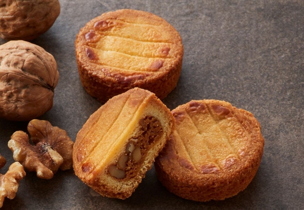 しっとりやわらかいクルミを、ほろ苦くとろけるキャラメルフィリングと合わせ、ほろほろとほどけるクッキーで包みました。
