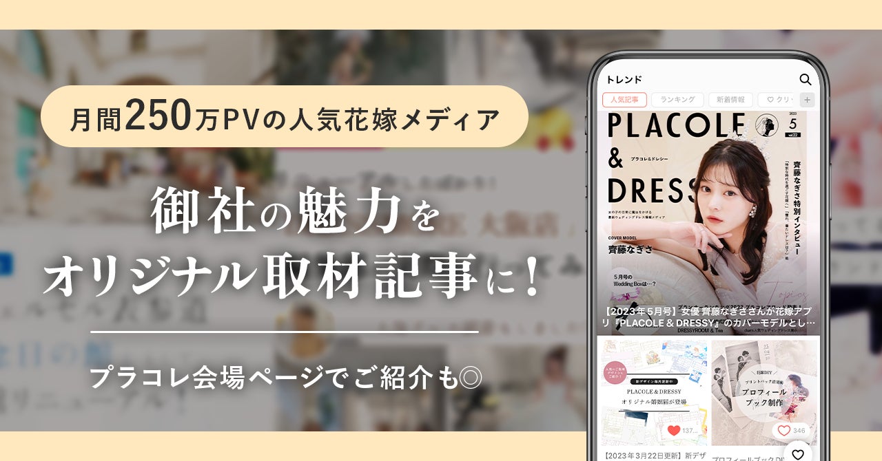 【体験型記事プラン】サービスの魅力を月間250万PVのウェディングメディア『PLACOLE&DRESSY』にて体験型取材記事制作&92.7万人へのSNS発信が可能に!