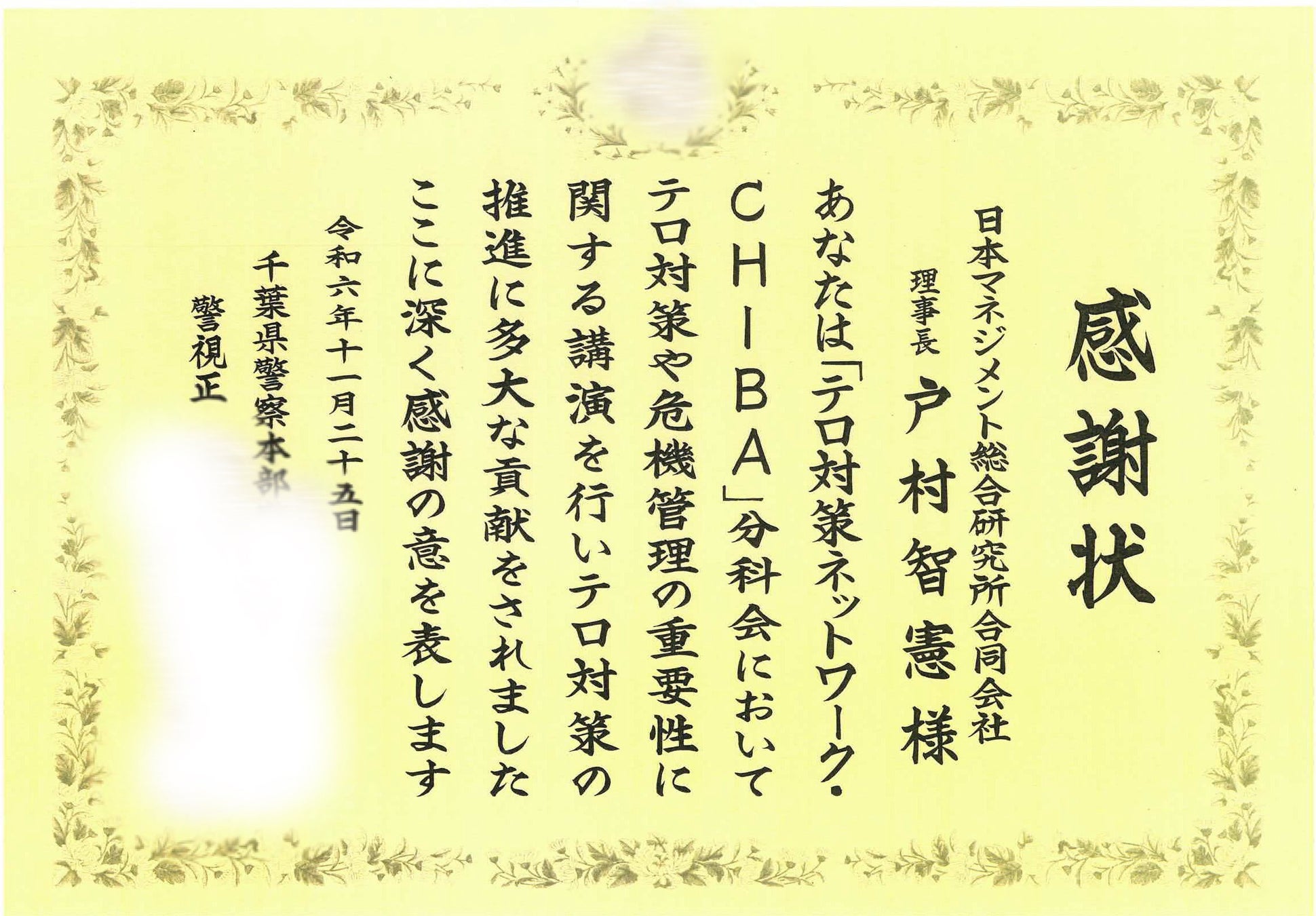 千葉県警察本部よりテロ対策指導の功績にて感謝状を拝受: 元・国連の専門官で弊社理事長の戸村智憲による非軍事の民間組織向けテロ対策指導【日本マネジメント総合研究所合同会社】