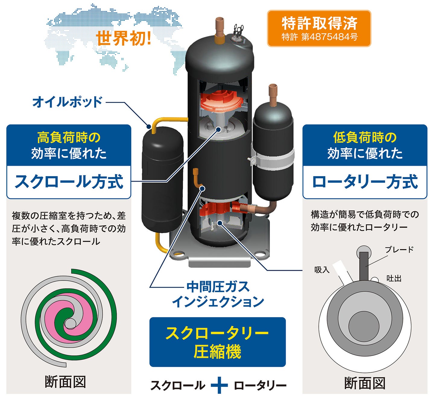 ※2 スクロール機構とロータリー機構を組み合わせた二段圧縮構造を採用した三菱重工サーマルシステムズ独自の圧縮機です。圧力の高い冷媒でも高効率を可能とする世界初の技術を採用しており、特許取得済みです。