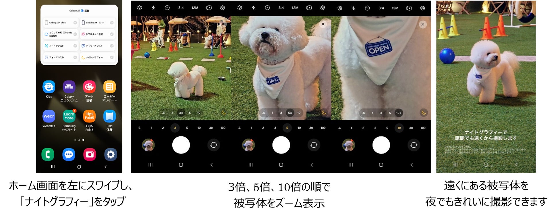 <体験方法> 夜の屋外で犬を撮影しながら、ナイトグラフィー機能で撮影する様子が確認できます。