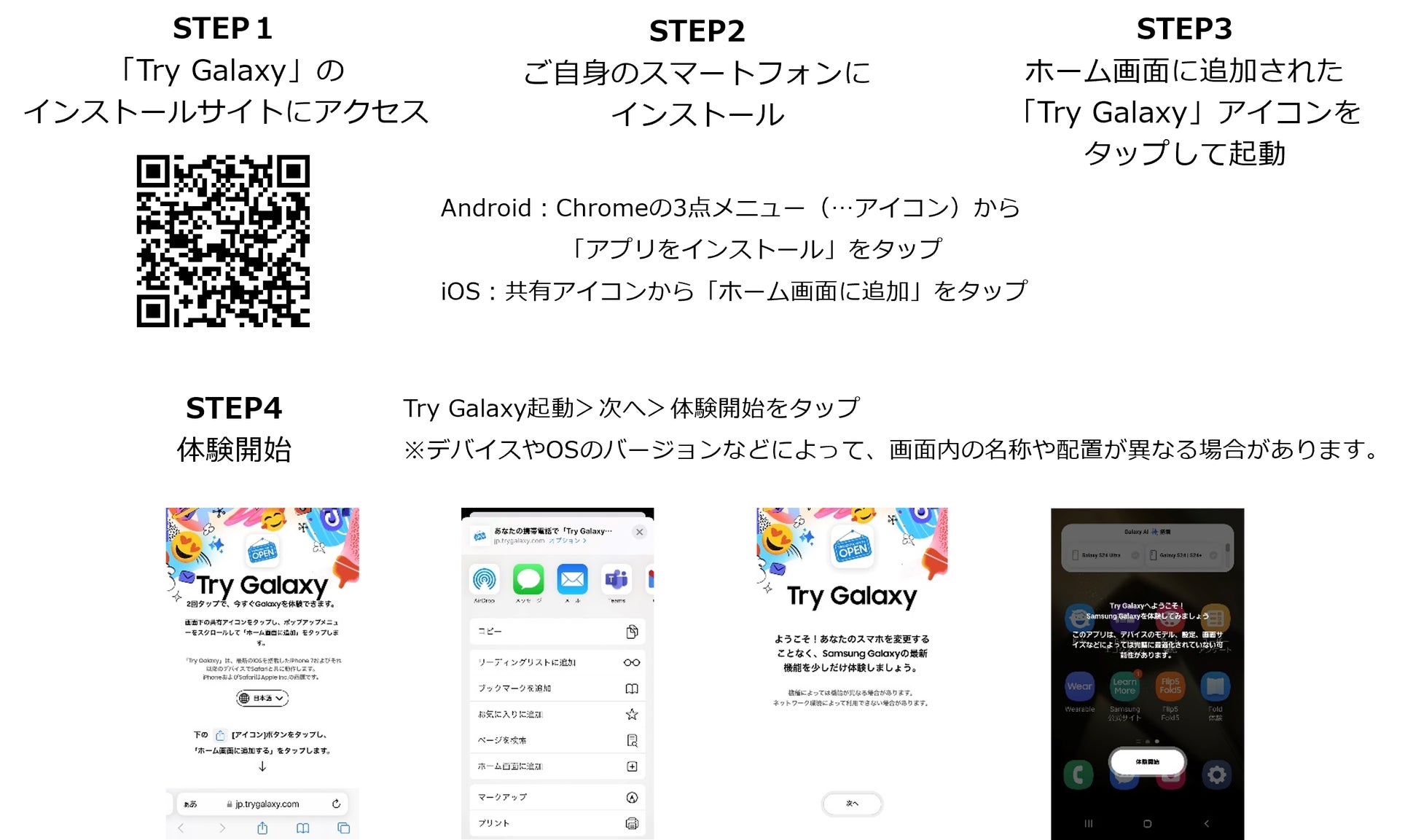 『Try Galaxy』は、Galaxyスマートフォンをお持ちでないお客様でも、お手持ちのスマートフォンで指定のQRコードをスキャンしホーム画面にショートカットを追加するだけでインストールが完了。いつでもどこでも、GalaxyのOSや各種アプリ、カメラ機能などをバーチャルでお楽しみいただける無料アプリです。