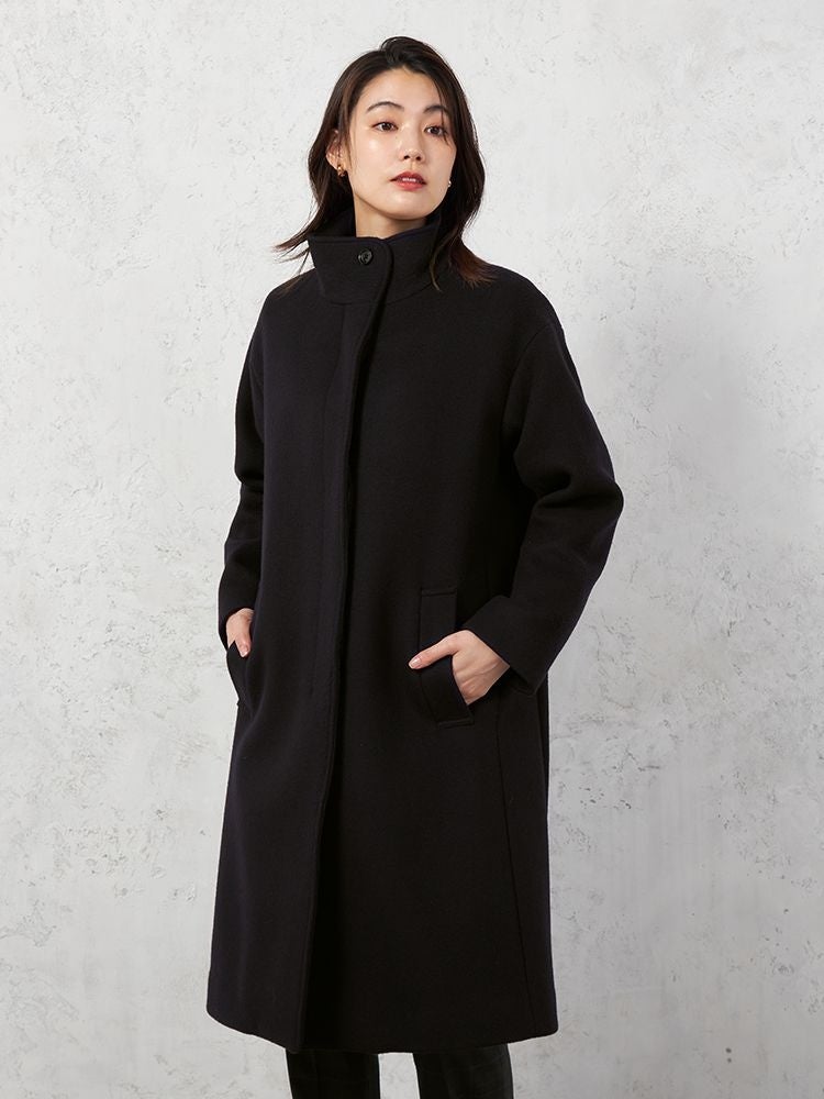 ソフトで滑らかな風合いが高級感を演出してくれるスタンドカラーコートは、衿ボタンを全部閉めたクールな着こなしのほか、ボタンを開けて衿を折り返したときには、小顔見えする嬉しい大きめな衿が特長です。ボクシーシルエットでひざ丈のため、ビジネススーツのパンツスタイルからスカートスタイルをはじめオフィスカジュアルなスタイリングや、ワンピースなどアイテムを問わずアウターとして活躍します。ベーシックなネイビーと柔らかな印象のブラウンの2色でご用意しました