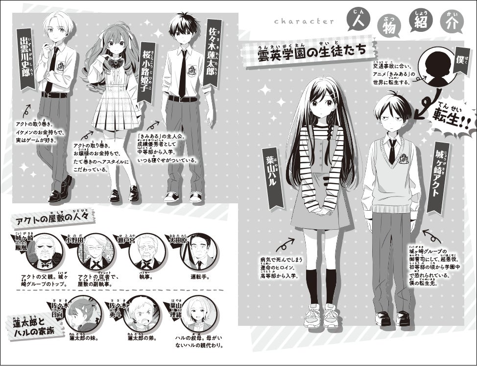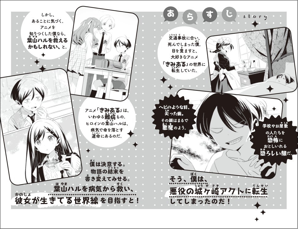 交通事故に遭い、大好きなアニメ「きみある」の世界に転生した僕。しかし、転生した先は主人公ではなく、悪役だった。彼の名は、城ヶ崎アクト。ヘビのような目にギザギザの歯、誰もがその顔を見ただけで震え上がる。大富豪の息子という立場を利用し、雲英学園では悪魔と恐れられている。……なぜ僕がアクトに? と訝しむ一方、僕にある考えが浮かぶ。アニメのシナリオを知り尽くした僕なら、葉山ハルのことを救えるのでは、と。そう、アニメ「きみある」はいわゆる難病もので、ヒロインのハルは白血病で亡くなってしまうのだ。恐怖の悪役アクトとして、僕はひとり奔走し――。