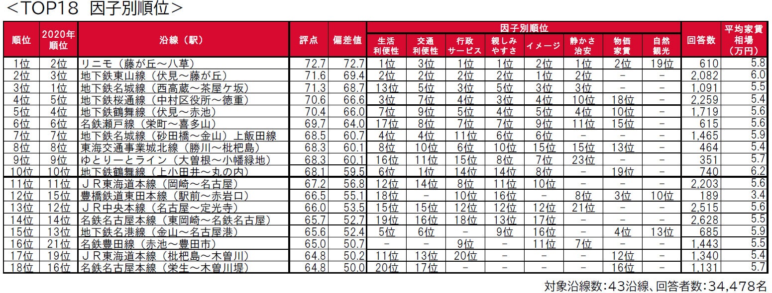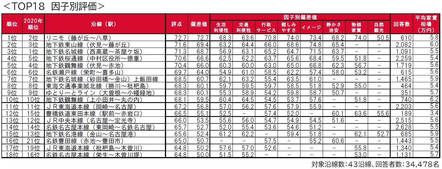- 街の住みここち沿線ランキング2021<愛知県版> TOP18の因子別評価