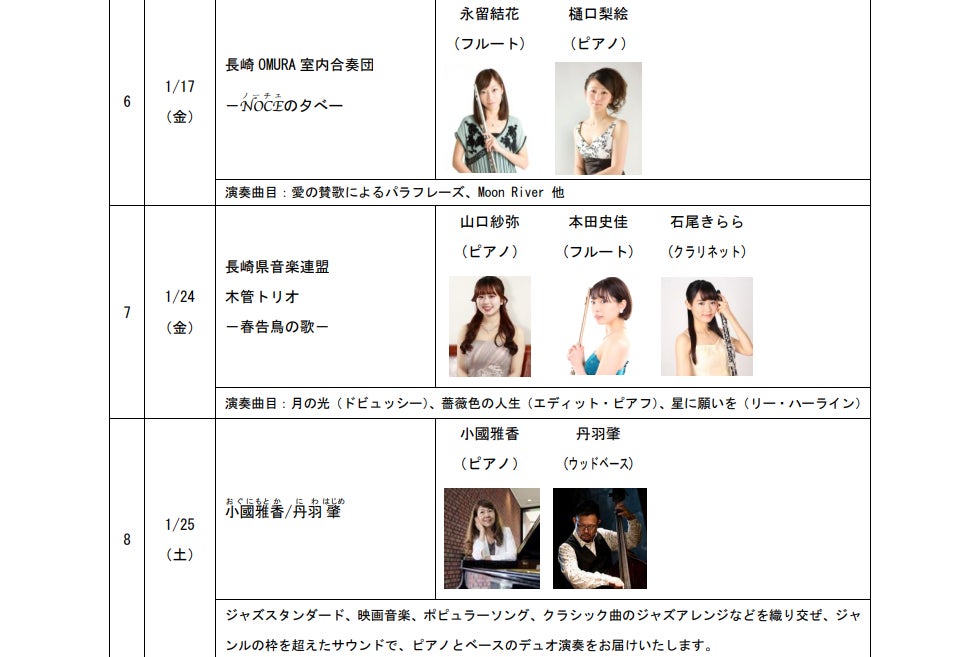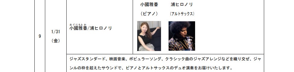 ※ 1 月 31 日(金)のみ、20 時半 / 21 時半より各回約 30 分演奏予定。