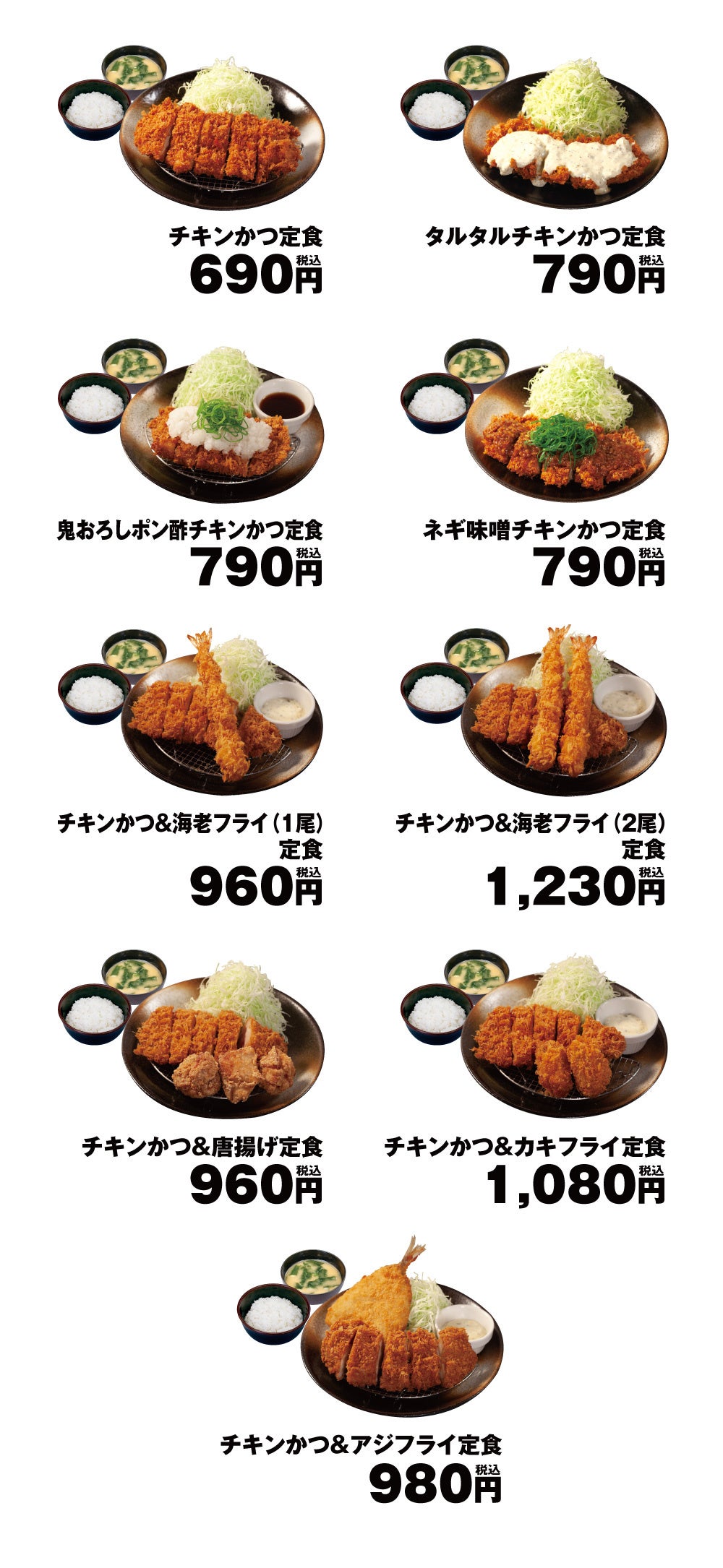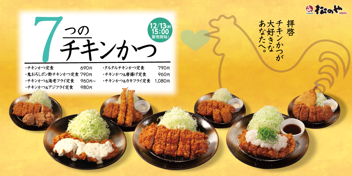 商品名 チキンかつ定食 690円 ネギ味噌チキンかつ定食 790円 タルタルチキンかつ定食 790円 鬼おろしポン酢チキンかつ定食 790円 チキンかつ&唐揚げ定食 960円 チキンかつ&海老フライ定食 (1尾)960円/(2尾)1,230円 チキンかつ&カキフライ(2個)定食 1,080円 チキンかつ&アジフライ定食 980円 得朝チキンかつ定食 530円 ※お持ち帰りいただけます。お持ち帰りのみそ汁は、別途60円でお買い求めいただけます。 ※全て税込価格です。また、店内・お持ち帰りの税込価格は同一です。 ※株主優待券は上記全てのメニューにご使用いただけます。(単品は除きます。) ※「得朝チキンかつ定食」は松屋併設店での販売はいたしません。 発売日 2023年12月13日(水)午後3時 対象店舗 一部店舗を除く全国の松のや ※高速PA店舗を除く |