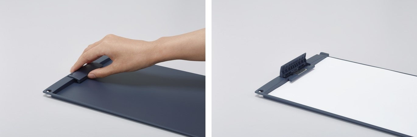 そこで今回発売するクリップボードには、新設計の薄型・静音クリップを搭載。厚さ約13mmとスリムでありながら、軽い開閉操作を実現しています。クリップは開いた状態でキープでき、とじるときに大きな音がしないのも特長です。