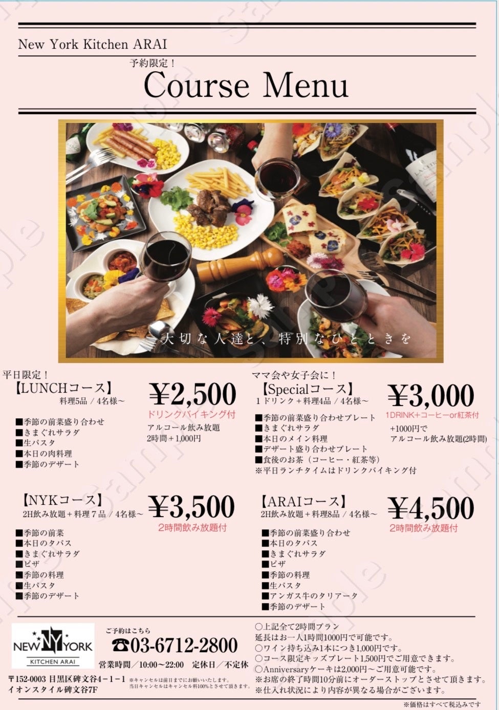 New York Kitchen ARAI(ニューヨークキッチンアライ)イオンスタイル碑文谷店7階(運営:株式会社RAVIPA 本社:東京都豊島区)では、ご予約限定の新コースメニューを公開!ランチコースから飲み放題付きのディナーコースまで充実しています。