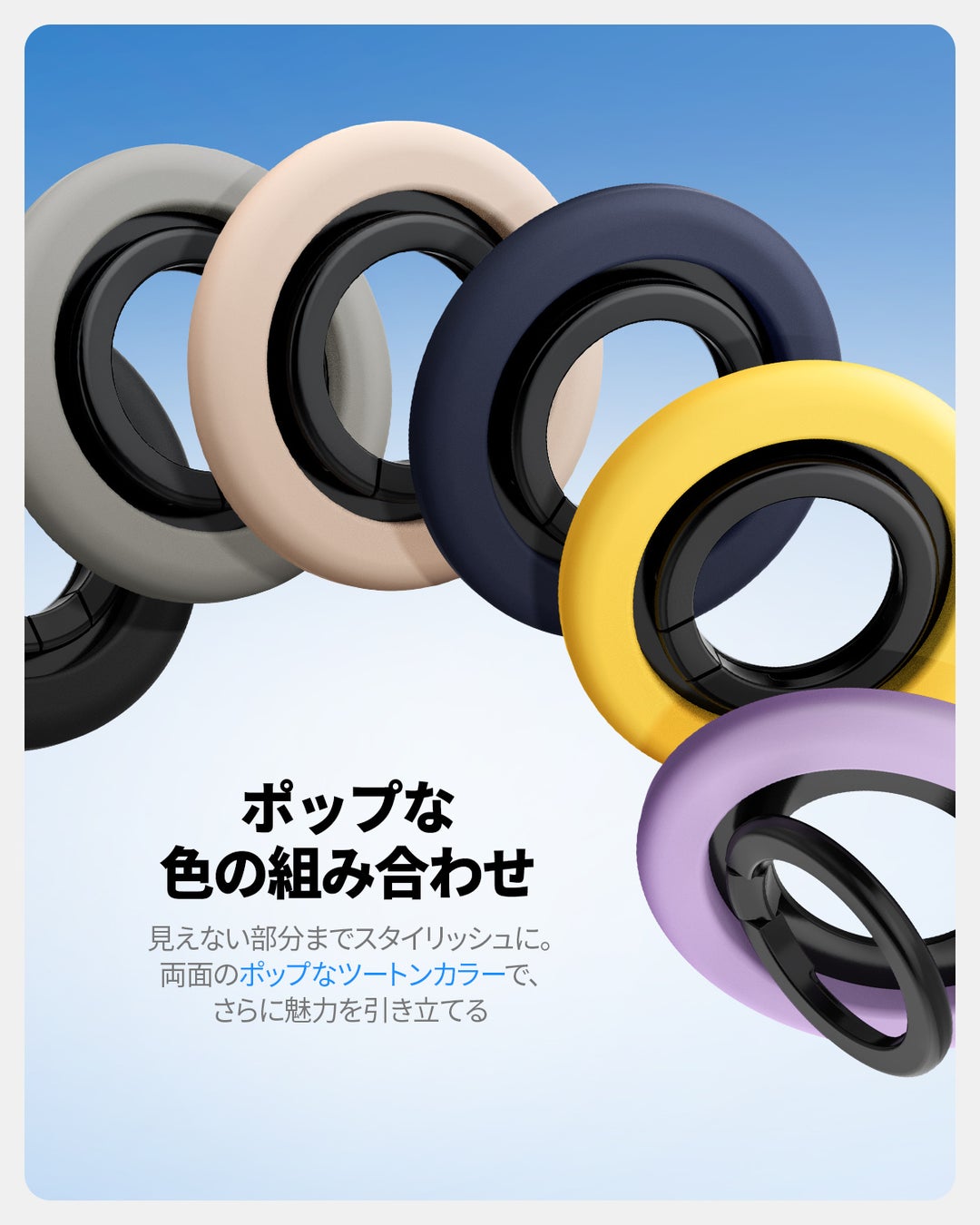 前面と背面に2つの「メタルリング」を搭載。背面にはデバイスを装着でき、前面にはスマホリングやスタンドなどのマグネット対応アクセサリーを取り付け可能です。