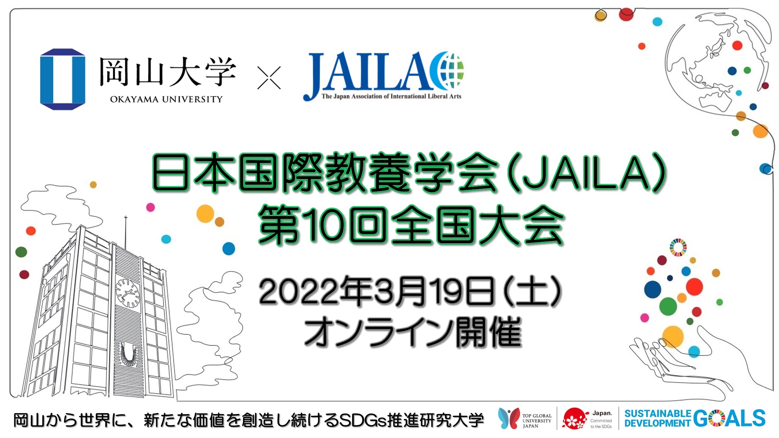 国立大学法人岡山大学(本部:岡山市北区、学長:槇野博史)では、担当校としてこの度、日本国際教養学会(JAILA)の第10回全国大会を2022年3月19日(土)にオンライン開催(担当校:岡山大学、共催:岡山大学全学教育・学生支援機構基幹教育センター)することになりました。