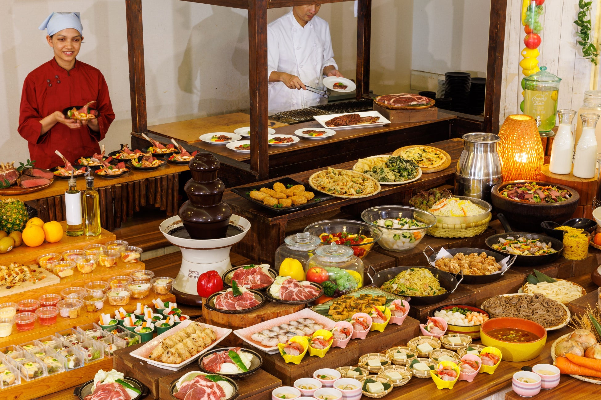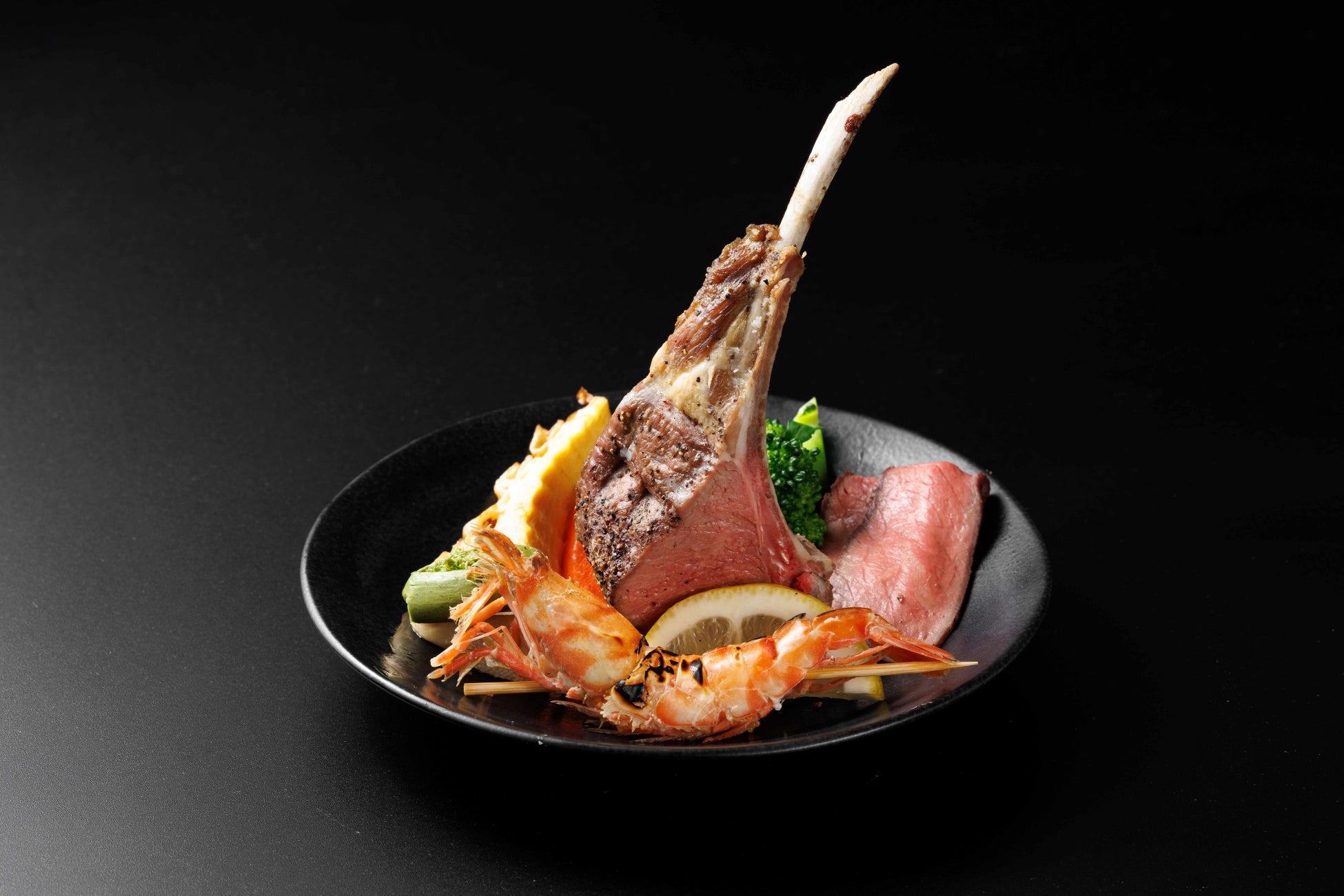 春の夕食ビュッフェでは、ご当地グルメ蒜山ジャージー牛のステーキが食べ放題。さらに、「ラムチョップと焼きモサエビワンプレート(2,000円)」をサービス。その他、郷土料理やご当地の食材にこだわったお料理が並びます。