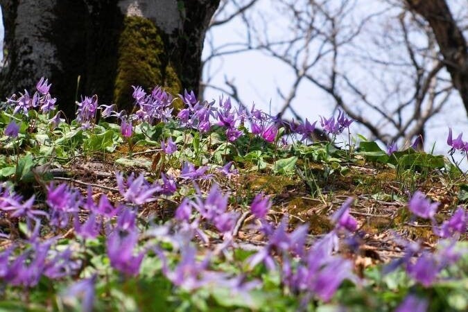 毛無山の春の風物詩、「春の妖精」と呼ばれるカタクリの花。新庄村の毛無山(けなしやま)~白馬山(はくばせん)の縦走路にはカタクリの群生地を見ることができ、通称"カタクリロード"と呼ばれています。珍しい白いカタクリの花が見られることもあり人気のコースです。眺望が抜群の毛無山山頂からは大山、蒜山三座、日本海の弓ヶ浜などが一望できます。