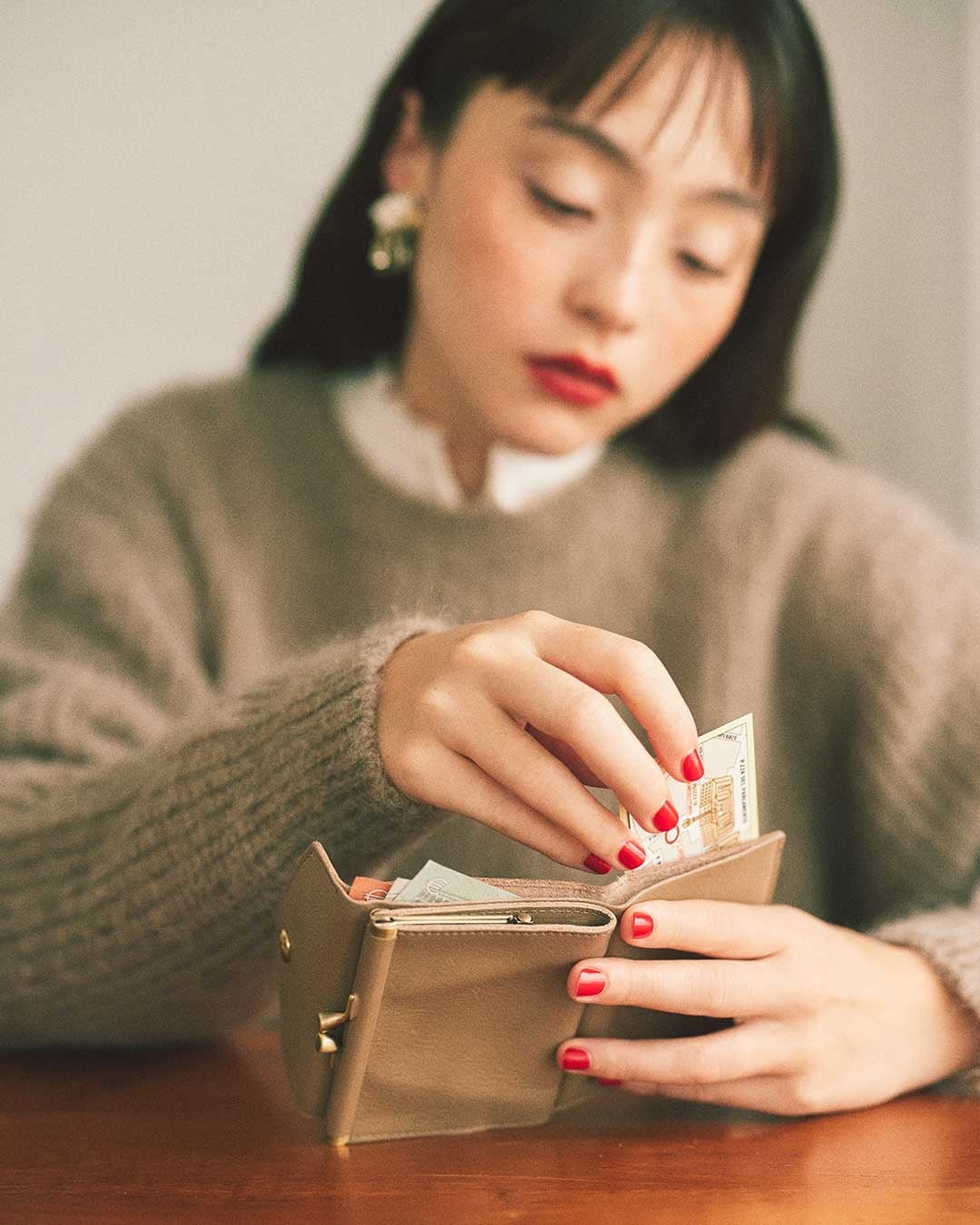 がま口型の小銭入れがキュートな折財布は、バッグやポケットに収まるコンパクトボディ。