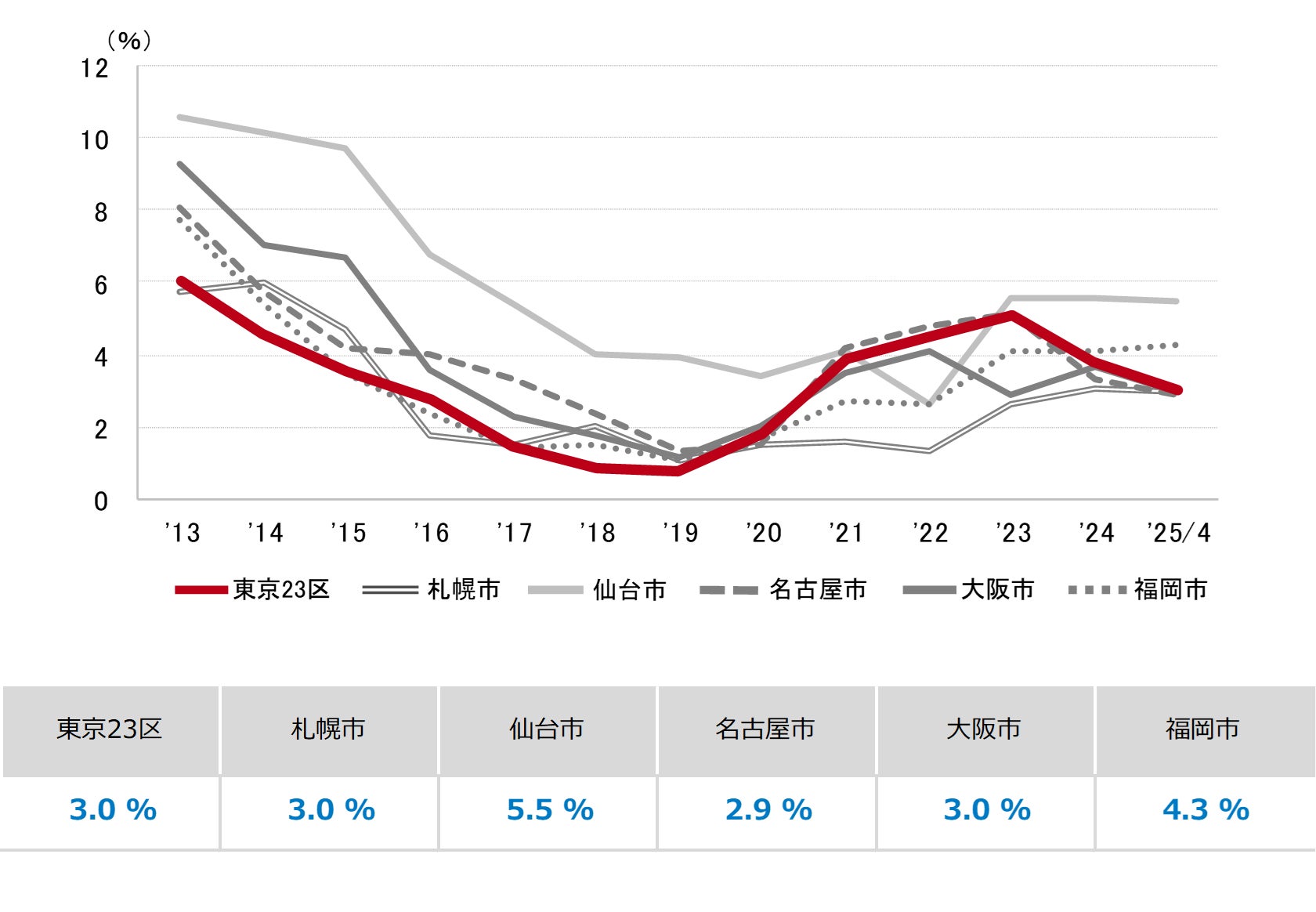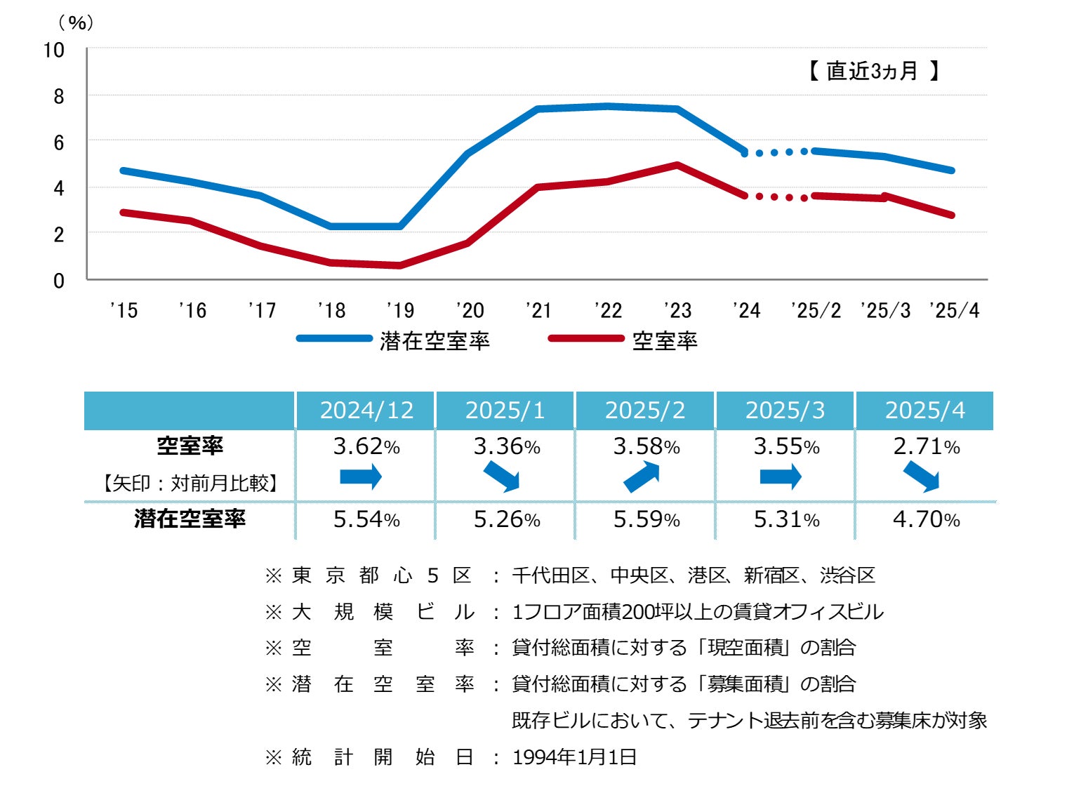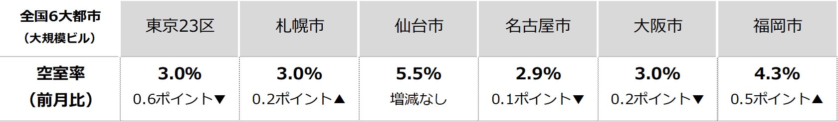 三幸エステート株式会社(本社:東京都中央区、取締役社長:武井重夫)は、2025年4月度の東京都心5区(千代田区、中央区、港区、新宿区、渋谷区)および全国6大都市(東京、札幌、仙台、名古屋、大阪、福岡)の大規模ビル※1のマーケットデータをまとめた「オフィスマーケット2025年5月号」を公表します。