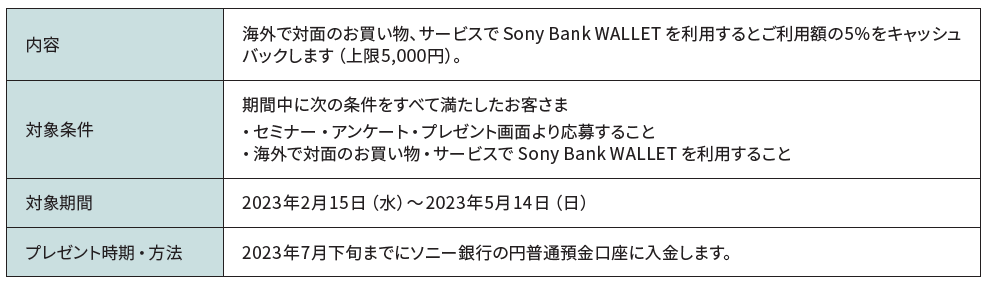 「Sony Bank WALLET 海外利用で利用額の5%をキャッシュバック」キャンペーン実施のお知らせ