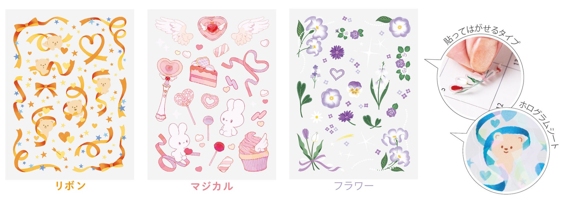 フォトカードやブロマイドなどのデコレーションにぴったりな、貼ってはがせるステッカーです。リボン、マジカル、フラワーの3柄×8色の全24種での展開で、推しの雰囲気やメンバーカラーに合わせてデザインを選べます。キラキラがかわいいホログラムシートを採用しているので、貼るだけで華やかに仕上がります。