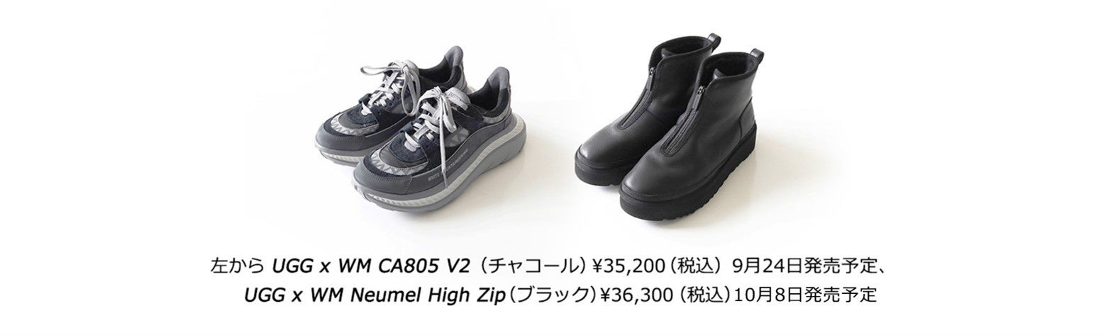 2020年秋冬に登場してベストセラーとなったUGG x WM CA805 Sneakerを2022年度春に発売を開始したUGGの新作スニーカーCA805 V2のスポーツアウトソールでアップデートし、White Mountaineeringのエッセンスをデザインや素材に落とし込んだUGG x WM CA805 V2。UGGのCA805 V2同様、軽さとクッション性、反発性をもたらすTreadlite by UGG™のソールで、ダイナミックサポートプラットフォームを内部に搭載する事で、着地から蹴り出しまでスムーズな足運びを実現するこのスニーカーは、ホールド感があり、1日中履いても疲れにくく快適な履き心地をもたらします。アッパーのサイドにUGGとWhite Mountaineeringの両ブランドのロゴタイプと、White MountaineeringのブランドイニシャルWとMを表現するトライアングルグラフィクのデザインが特徴で、オーバーレイにヌバックと毛足の長いスウェードを使用することで、よりラグジュアリーな仕上がりとなりました。UGG x WM Neumel High Zip(UGG x WMニューメル ハイ ジップ)は、2021年秋冬に話題を呼んだUGG x WM Zip Bootのアッパー素材を柔らかなウォータープルーフの表皮にアップデートして再登場。よりモダンで洗練されたデザインに仕上げるべく、パーツのはぎ目を極力排し、フロントにジッパーをあしらいました。ジッパーに加えフィット感も調整しているので、ブーツにありがちな着脱のストレスがありません。White Mountaineering定番の極厚ソールも健在です。