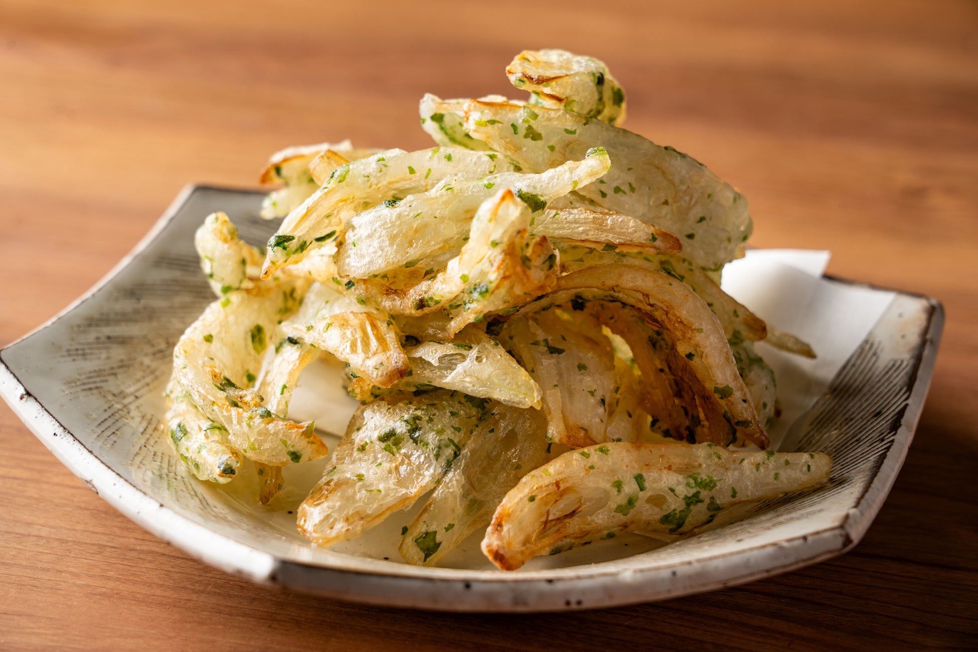 生で食べても美味しい新玉ねぎを”のり塩”味でサッと揚げました。